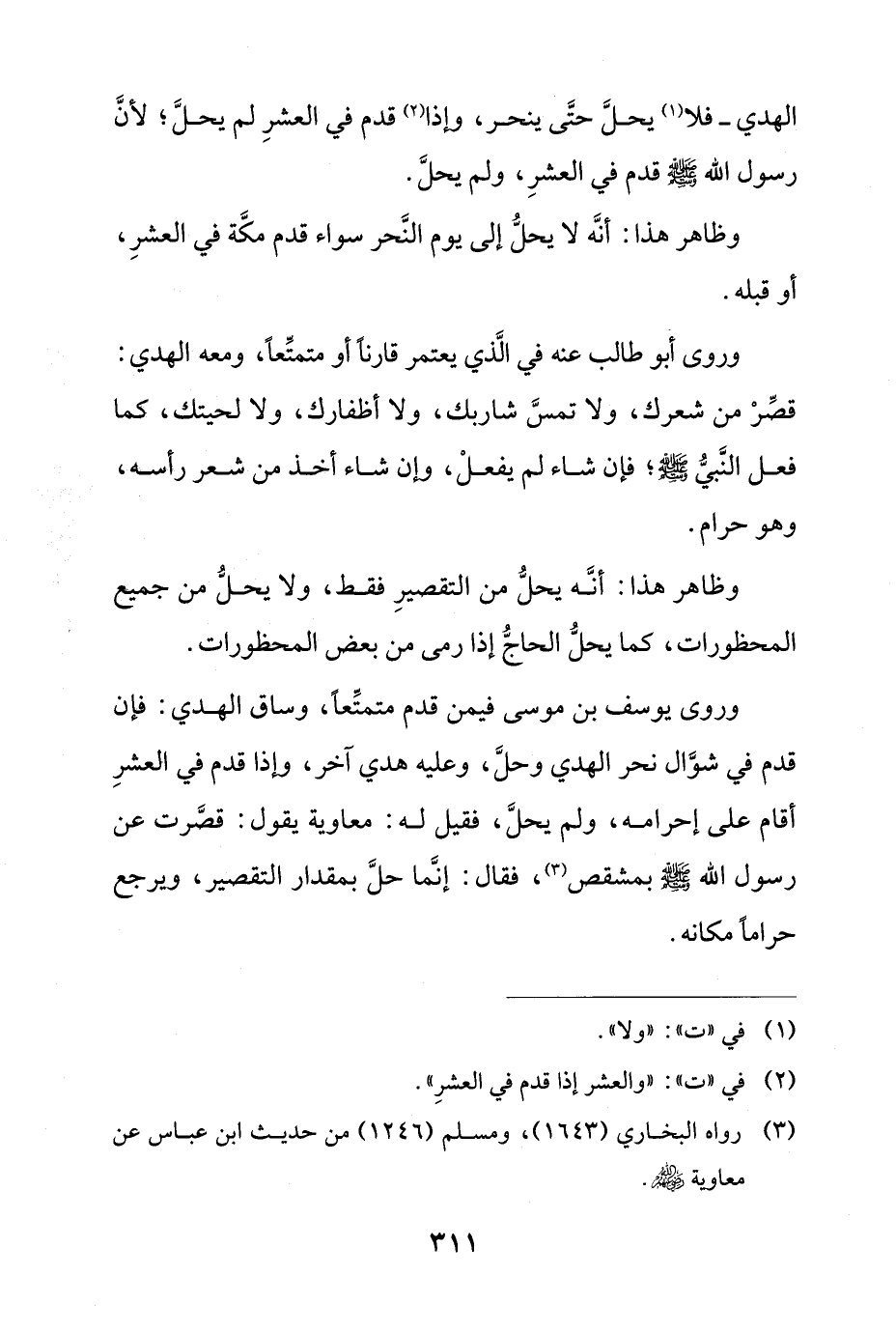 وروى أبو طالب عنه في الذي يعتمر قارناً أو متمتعاً، ومعه الهدي: قصر من شعرك، ولا تمس شاربك، ولا أظفارك، ولا لحيتك، كما فعل النبيصلى الله عليه وسلم؛ فإن شاء لم يفعل، وإن شاء أخذ من شعر رأسه، وهو حرام.