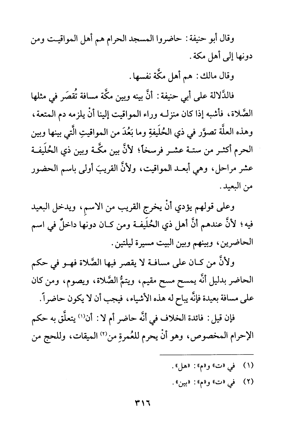 فإن قيل: فائدة الخلاف في أنه حاضر أم لا: أن يتعلق به حكم الإحرام المخصوص، وهو أن يحرم للعمرة من الميقات، وللحج من