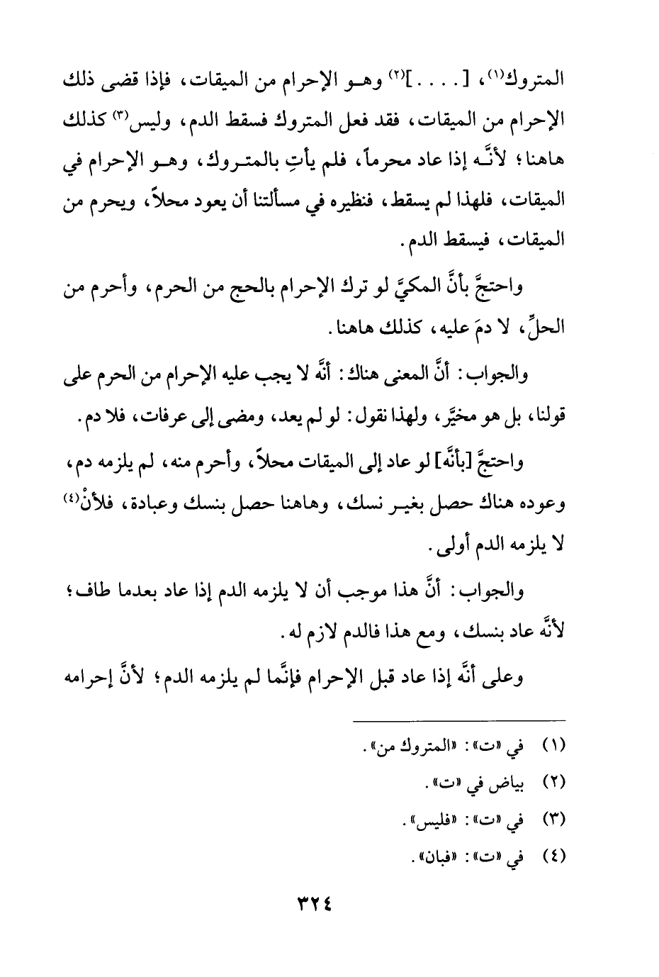 المتروك، [....] وهو الإحرام من الميقات، فإذا قضى ذلك الإحرام من الميقات، فقد فعل المتروك فسقط الدم، وليس كذلك هاهنا؛ لأنه إذا عاد محرماً، فلم يأت بالمتروك، وهو الإحرام في الميقات، فلهذا لم يسقط، فنظيره في مسألتنا أن يعود محلاً، ويحرم من الميقات، فيسقط الدم.