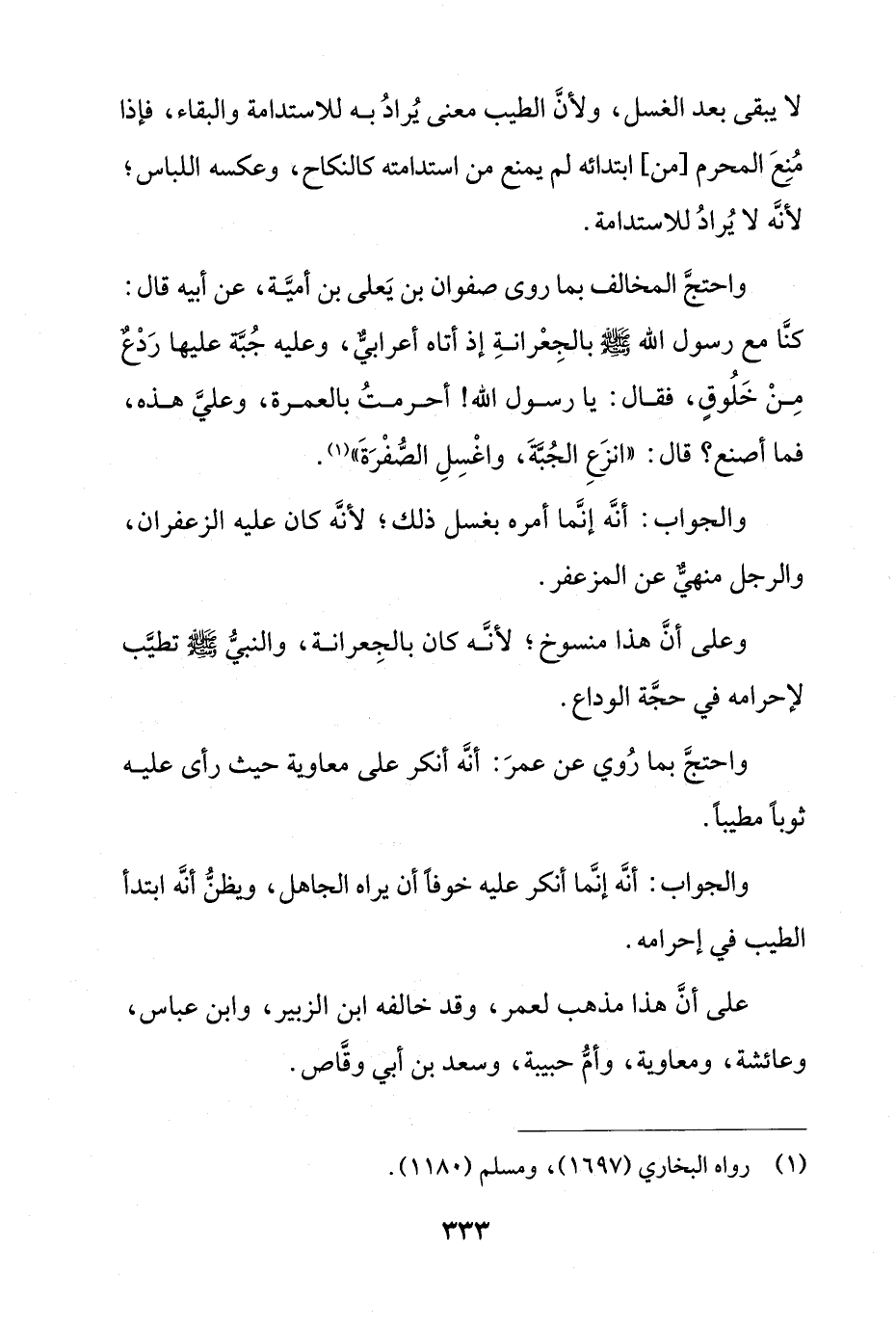 واحتج المخالف بما روى صفوان بن يعلى بن أمية، عن أبيه قال: كنا مع رسول الله صلى الله عليه وسلم بالجعرانة إذ أتاه أعرابي، وعليه جبة عليها ردع من خلوق، فقال: يا رسول الله! أحرمت بالعمرة، وعلي هذه، فما أصنع؟ قال: "انزع الجبة، واغسل الصفرة".
