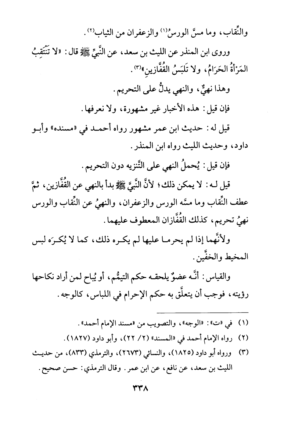 قيل له: لا يمكن ذلك؛ لأن النبي صلى الله عليه وسلم بدأ بالنهي عن القفازين، ثم عطف النقاب وما مسه الورس والزعفران، والنهي عن النقاب والورس نهي تحريم، كذلك القفازان المعطوف عليهما.