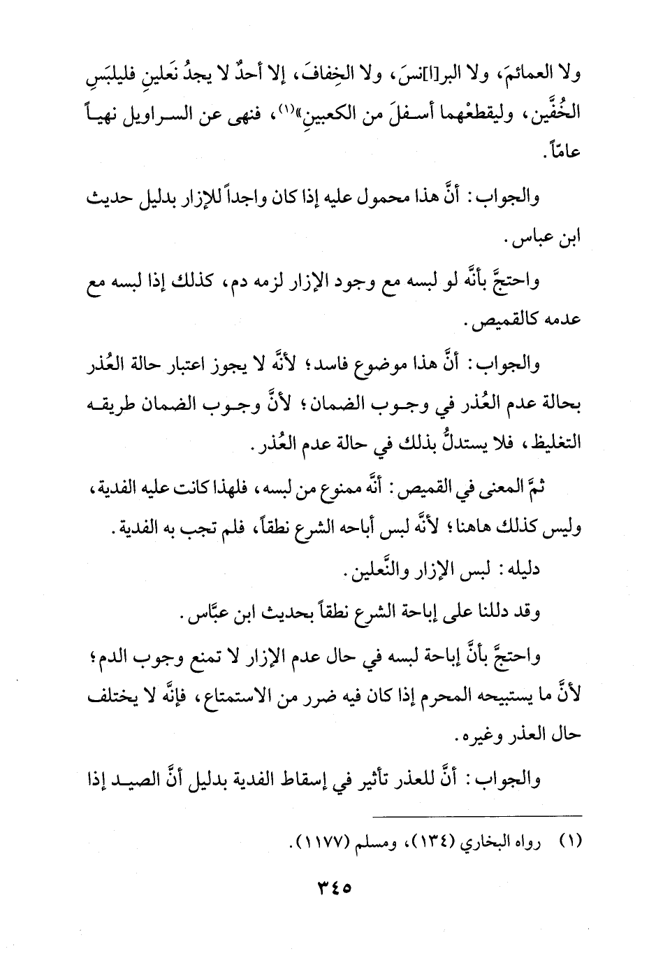 واحتج بأن إباحة لبسه في حالة عدم الإزار لا تمنع وجوب الدم؛ لأن ما يستبيحه المحرم إذا كان فيه ضرر من الاستمتاع، فإنه لا يختلف حال العذر وغيره.