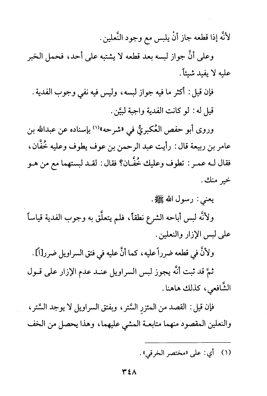 وروى أبو حفص العكبري في "شرحه" بإسناده عن عبد الله بن عامر بن ربيعة قال: رأيت عبد الرحمن بن عوف يطوف وعليه خفان، فقال له عمر: تطوف وعليك خفان؟ فقال: لقد لبستهما مع من هو خير منك.