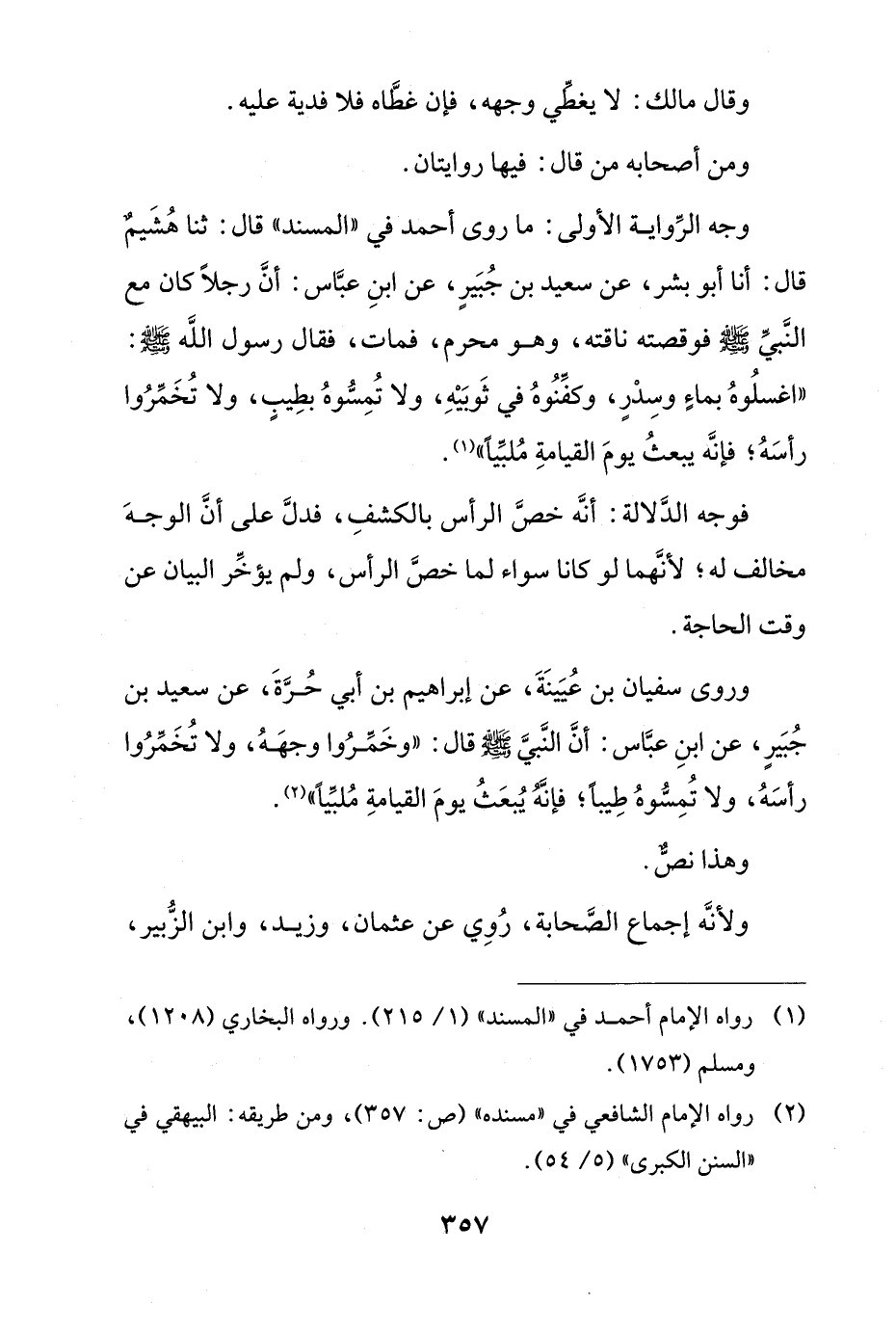 وجه الرواية الأولى: ما روى أحمد في "المسند" قال: ثنا هشيم قال: أنا أبو بشر، عن سعيد بن جبير، عن ابن عباس: أن رجلاً كان مع النبي صلى الله عليه وسلم فوقصته ناقته، وهو محرم، فمات، فقال رسول الله صلى الله عليه وسلم: "اغسلوه بماء وسدر، وكفنوه في ثوبيه، ولا تمسوه بطيب، ولا تخمروا رأسه؛ فإنه يبعث يوم القيامة ملبياً".