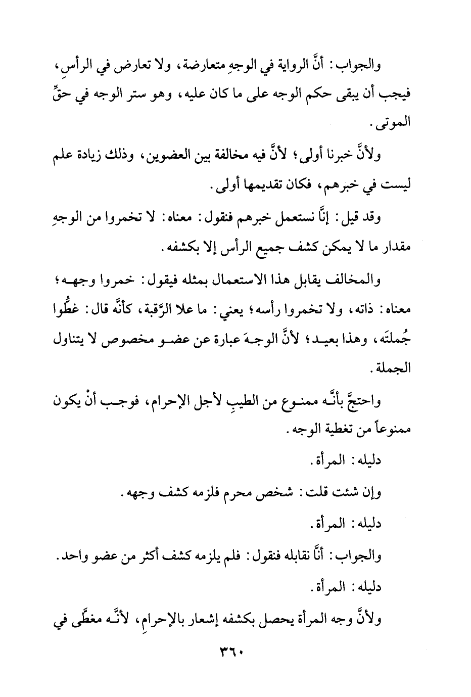 والمخالف يقابل هذا الاستعمال بمثله فيقول: خمروا وجهه؛ معناه: ذاته، ولا تخمروا رأسه؛ يعني: ما علا الرقبة، كأنه قال: غطوا جملته، وهذا بعيد؛ لأن الوجه عبارة عن عضو مخصوص لا يتناول الجملة.