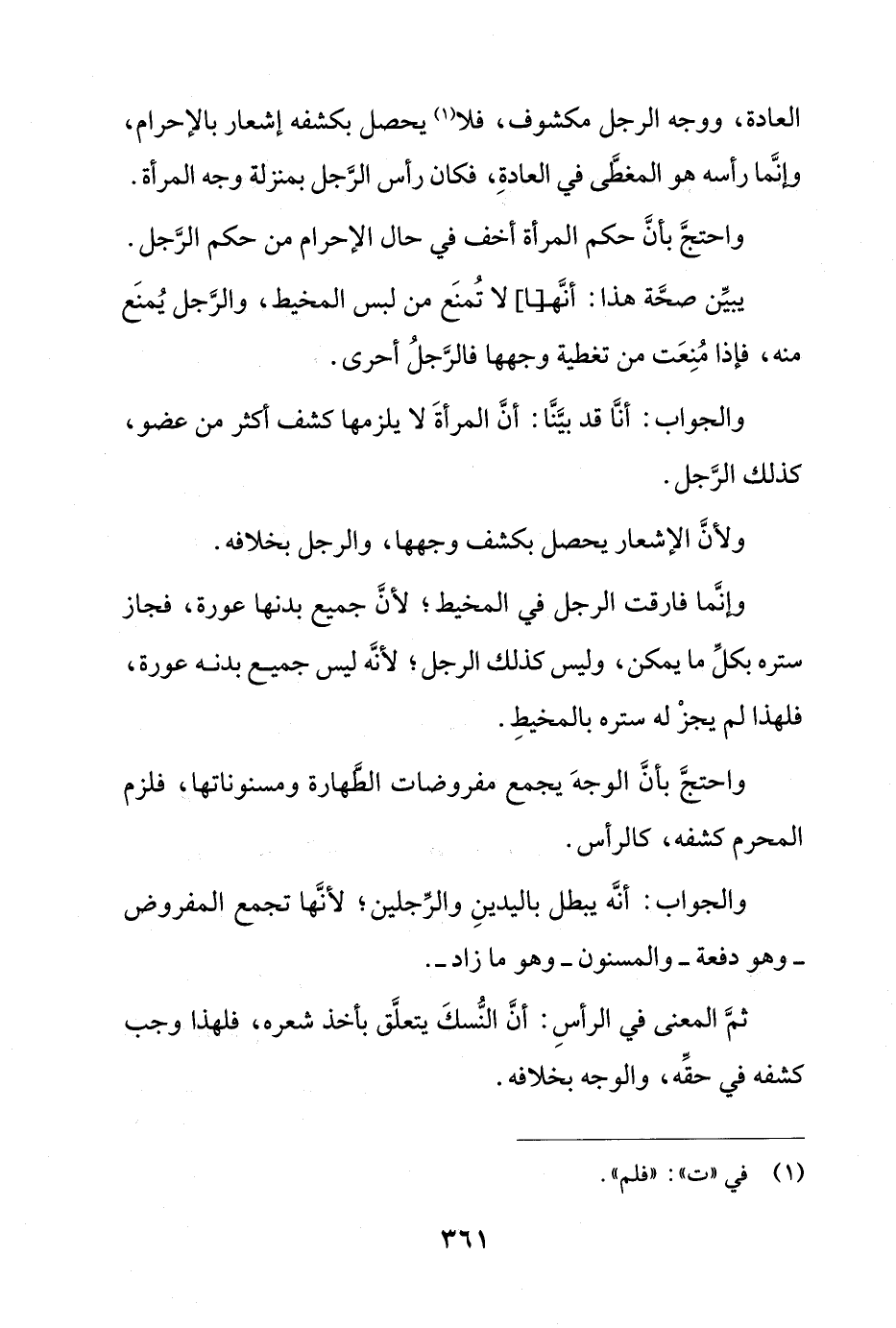 يبين صحة هذا: أنهـ[ـــا] لا تمنع من لبس المخيط، والرجل يمنع منه، فإذا منعت من تغطية وجهها فالرجل أحرى.