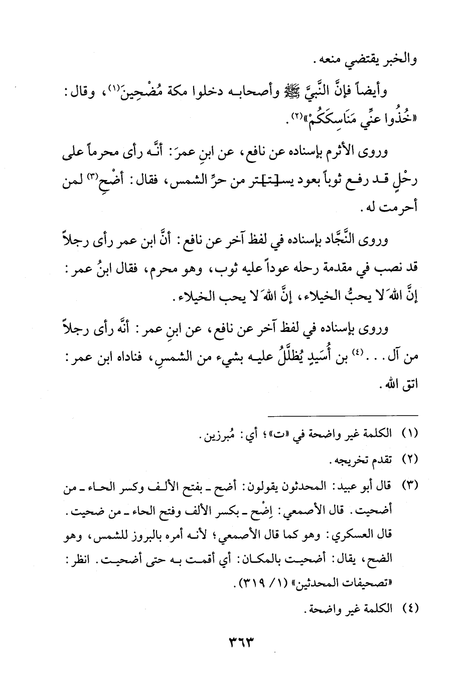 وروى بإسناده في لفظ آخر عن نافع، عن ابن عمر: أنه رأى رجلاً من آل ... بن أسيد يظلل عليه بشيء من الشمس، فناداه ابن عمر: اتق الله.