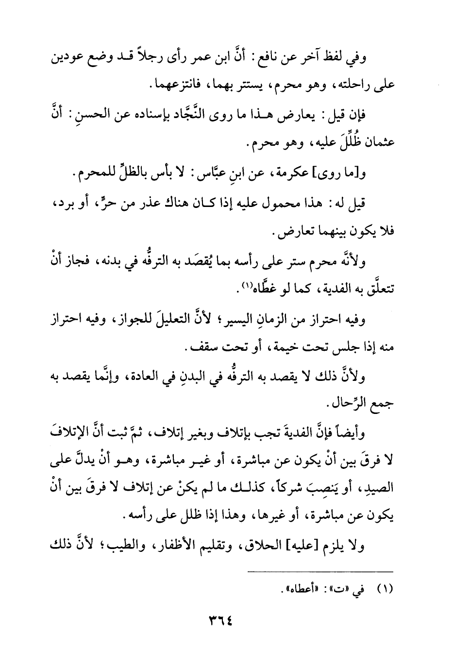 وأيضاً فإن الفدية تجب بإتلاف وبغير إتلاف، ثم ثبت أن الإتلاف لا فرق بين أن يكون عن مباشرة، أو غير مباشرة، وهو أن يدل على الصيد، أو ينصب شركاً، كذلك ما لم يكون عن إتلاف لا فرق بين أن يكون عن مباشرة، أو غيرها، وهذا إذا ظلل على رأسه.