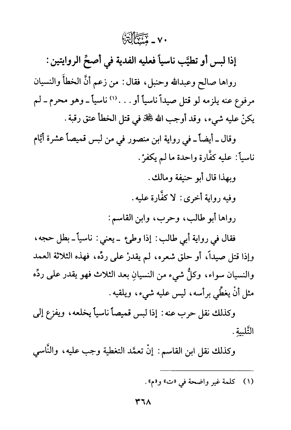 رواها صالح وعبد الله وحنبل، فقال: من زعم أن الخطأ والنسيان مرفوع عنه يلزمه لو قتل صيداً ناسياً أو ... ناسياً - وهو محرم - لم يكن عليه شيء، وقد أوجب الله عز وجل في قتل الخطأ عتق رقبة.