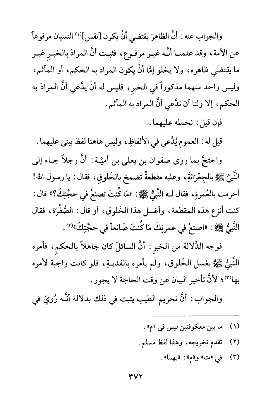 فوجه الدلالة من الخبر: أن السائل كان جاهلاً بالحكم، فأمره النبي صلى الله عليه وسلم بغسل الخلوق، ولم يأمره بالفدية، فلو كانت واجبة لأمره بها؛ لأن تأخير البيان عن وقت الحاجة لا يجوز.