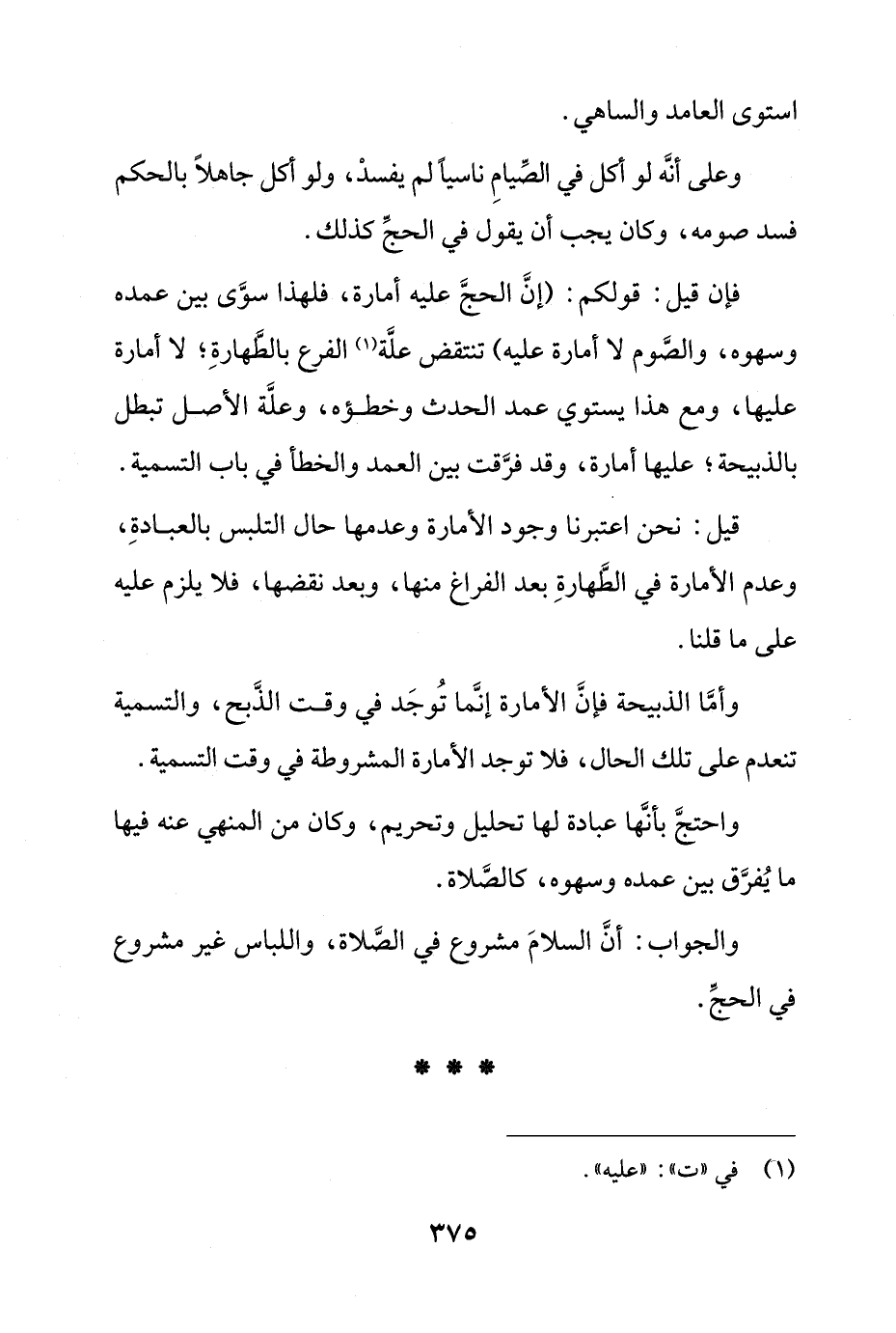 فإن قيل: قولكم: (إن الحج عليه أمارة، فلهذا سوى بين عمده وسهوه، والصوم لا أمارة عليه) تنتقض علة الفرع بالطهارة؛ لا أمارة عليها، ومع هذا يستوي عمد الحدث وخطؤه، وعلة الأصل تبطل بالذبيحة؛ عليها أمارة، وقد فرقت بين العمد والخطأ في باب التسمية.