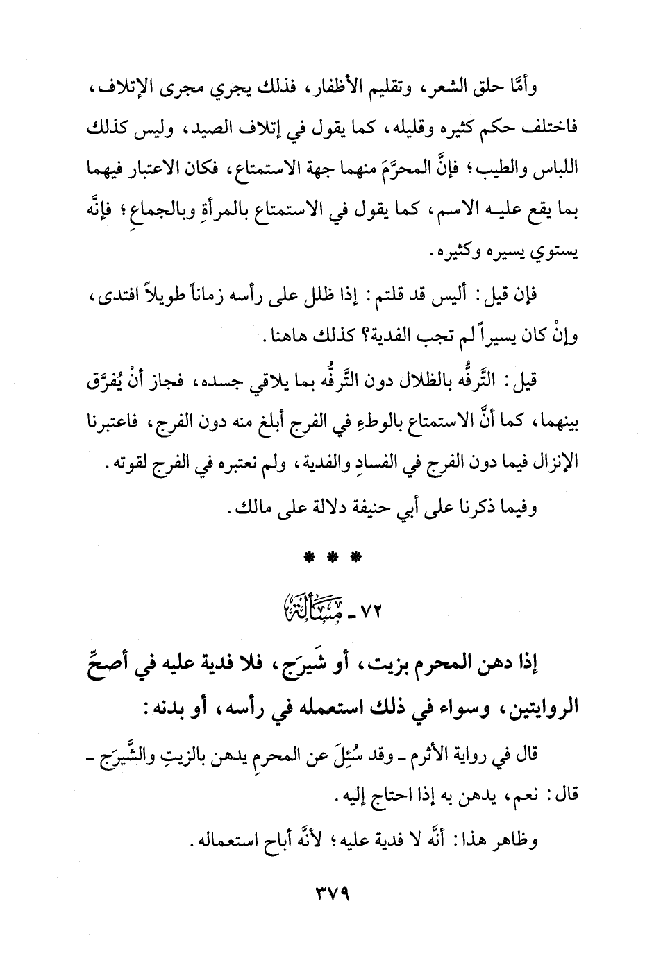 وأما حلق الشعر، وتقليم الأظفار، فذلك يجري مجرى الإتلاف، فاختلف حكم كثيرة وقليله، كما يقول في إتلاف الصيد، وليس كذلك اللباس والطيب؛ فإن المحرم منهما جهة الاستمتاع، فكان الاعتبار فيهما بما يقع عليه الاسم، كما يقول في الاستمتاع بالمرأة وبالجماع؛ فإنه يستوي يسيره وكثيره.