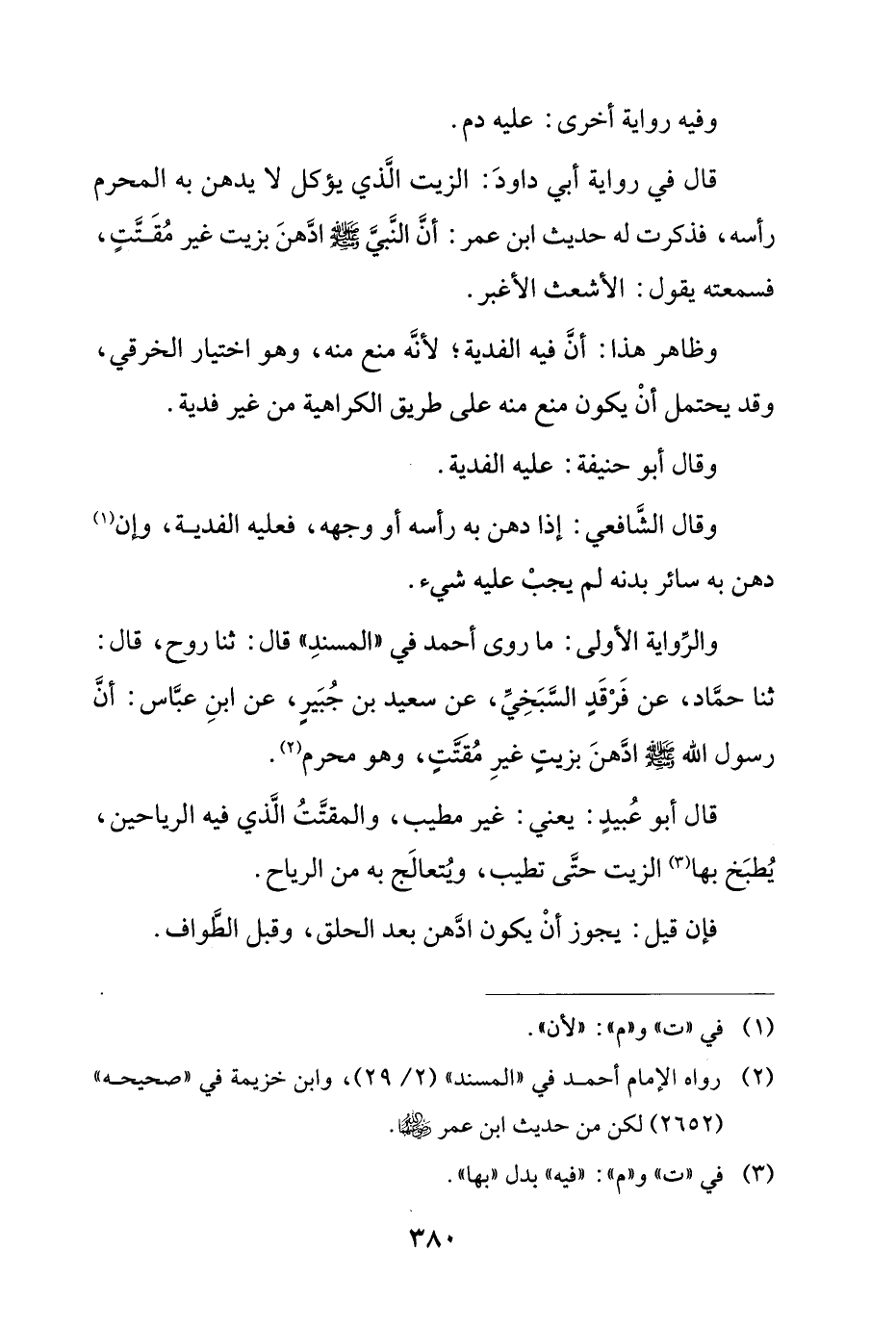 والرواية الأولى: ما روى أحمد في "المسند" قال: ثنا روح، قال: ثنا حماد، عن فرقد السبخي، عن سعيد بن جبير، عن ابن عباس: أن رسول الله صلى الله عليه وسلم ادهن بزيت غير مقتت، وهو محرم.