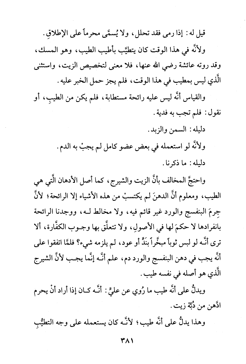 ولأنه في هذا الوقت كان يتطيب بأطيب الطيب، وهو المسك، وقد روته عائشة رضي الله عنها، فلا معنى لتخصيص الزيت، واستثنى الذي ليس بمطيب في هذا الوقت، فلم يجز حمل الخبر عليه.