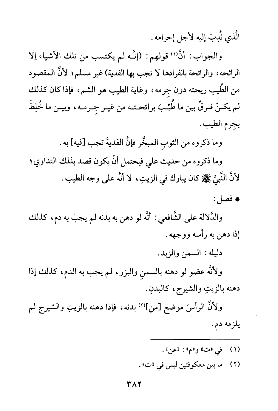 والجواب: أن قولهم: (إنه لم يكتسب من تلك الأشياء إلا الرائحة، والرائحة بانفرادها لا تجب بها الفدية) غير مسلم؛ لأن المقصود من الطيب ريحته دون جرمه، وغاية الطيب هو الشم، فإذا كان كذلك لم يكن فرق بين ما طيب برائحته من غير جرمه، وبين ما خلط بجرم الطيب.
