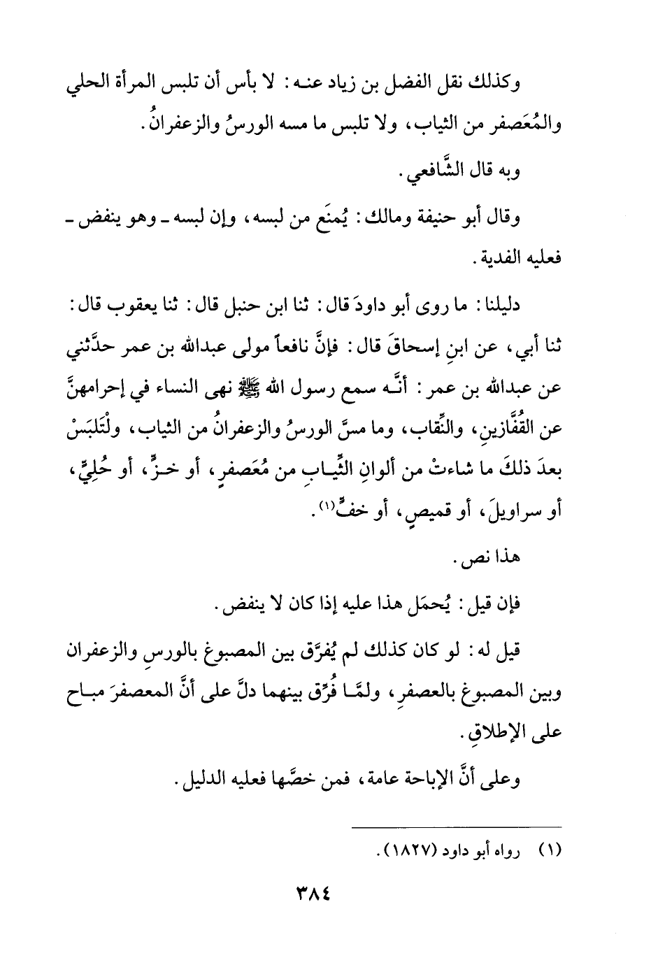 وكذلك نقل الفضل بن زياد عنه: لا بأس أن تلبس المرأة الحلي والمعصفر من الثياب، ولا تلبس ما مسه الورس والزعفران.