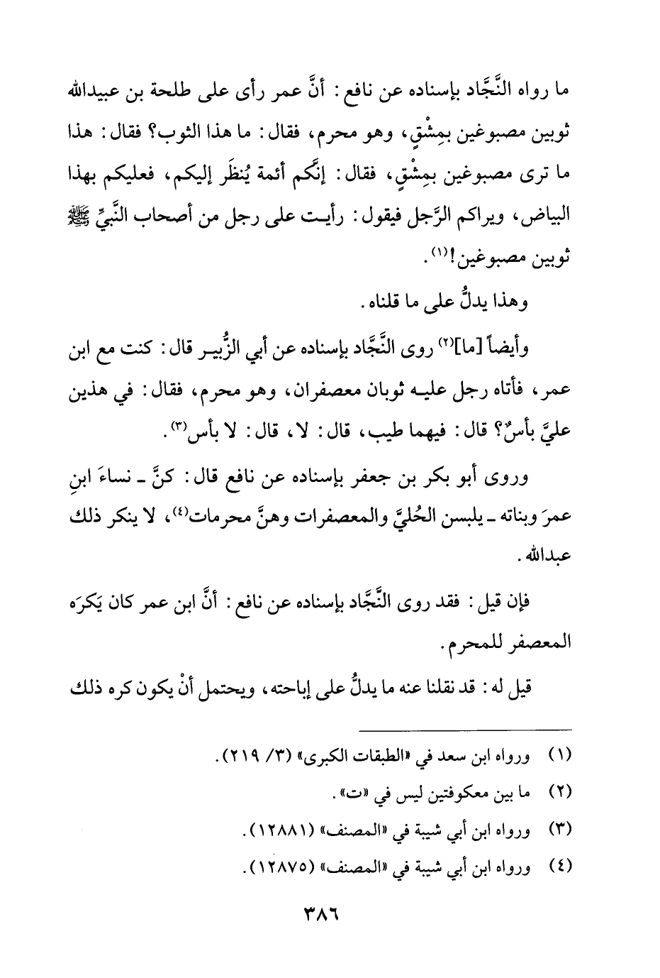 وأيضا [ما] روى النجاد بإسناده عن أبي الزبير قال: كنت مع ابن عمر، فأتاه رجل عليه ثوبان معصفران، وهو محرم، فقال: في هذين علي بأس؟ قال: فيهما طيب، قال: لا، قال: لا بأس.