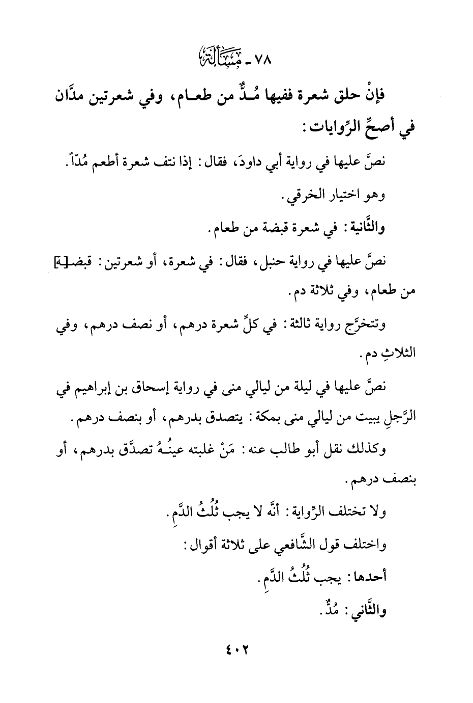 نص عليها في رواية حنبل، فقال: في شعرة، أو شعرتين: قبضـ[ــه] من طعام، وفي ثلاثة دم.