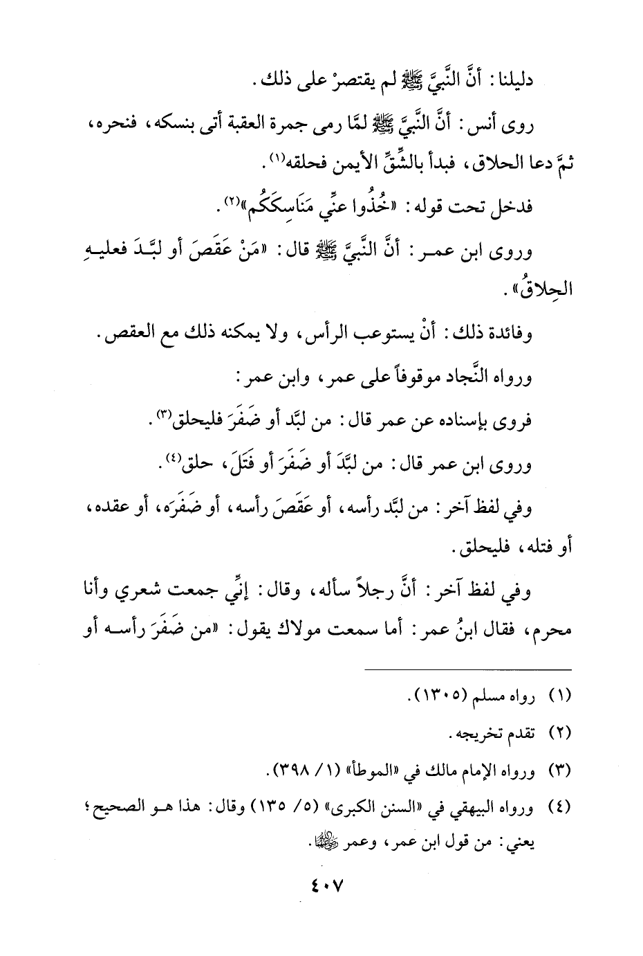 وفي لفظ آخر: أن رجلاً سأله، وقال: إني جمعت شعري وأنا محرم، فقال ابن عمر: أما سمعت مولاك يقول: "من ضفر رأسه أو