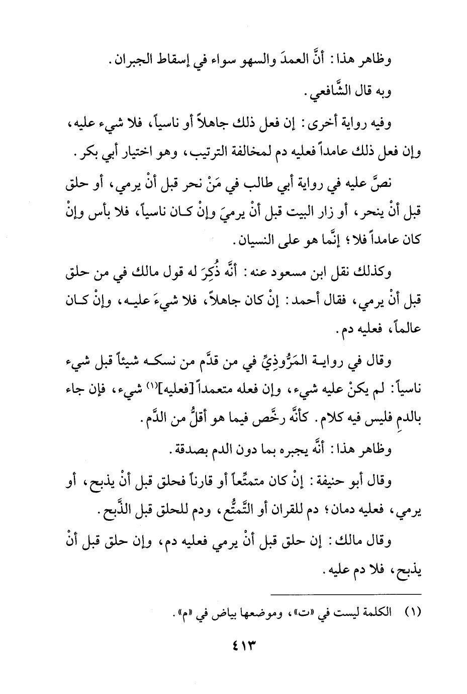 وكذلك نقل ابن مسعود عنه: أنه ذكر له قول مالك في من حلق قبل أن يرمي، فقال أحمد: إن كان جاهلاً، فلا شيء عليه، وإن كان عالماً، فعليه دم.
