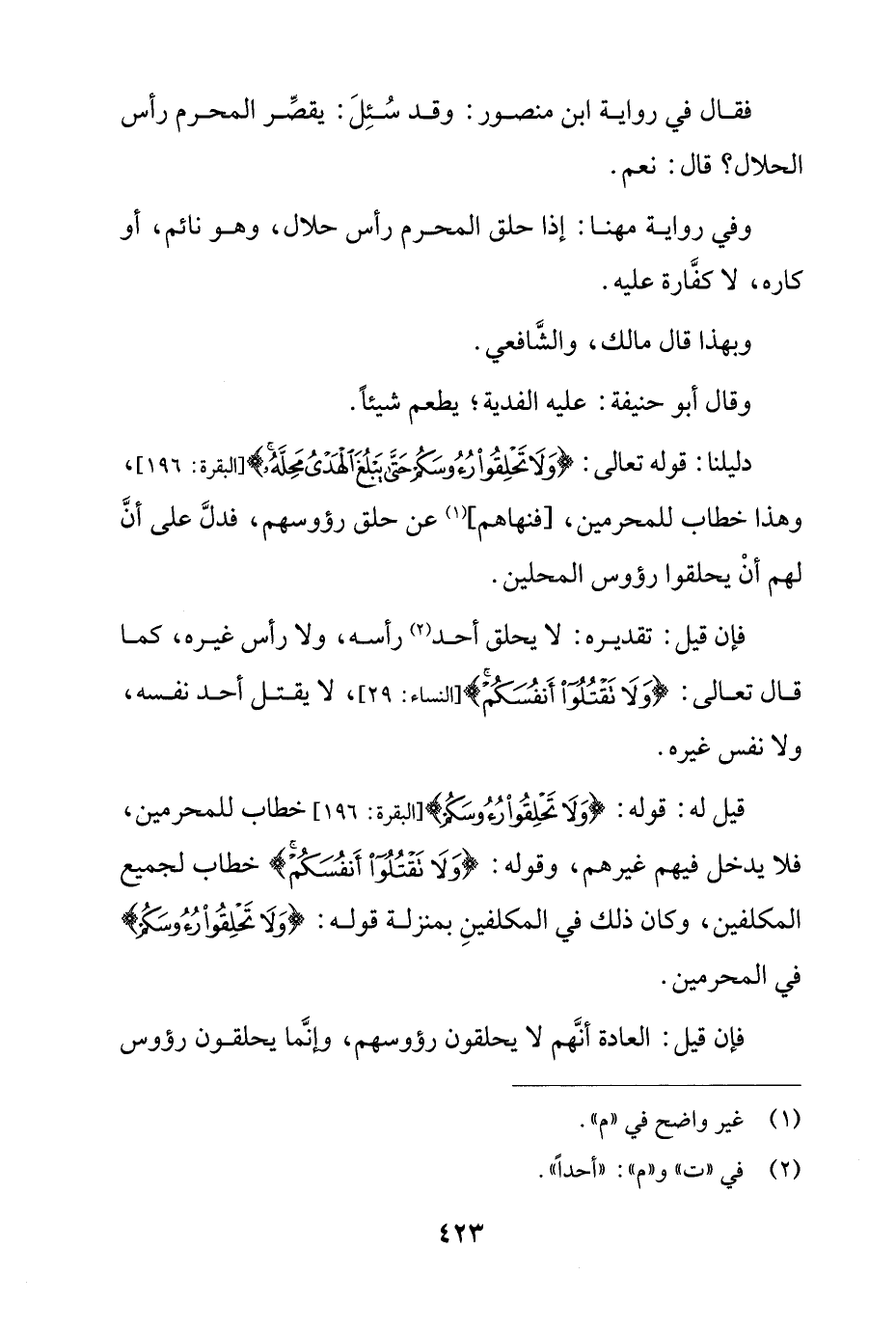 فإن قيل: تقديره: لا يحلق أحد رأسه، ولا رأس غيره، كما قال تعالى: {ولا تَقْتُلُوا أَنفُسَكُمْ} [النساء: 29]، لا يقتل أحد نفسه، ولا نفس غيره.