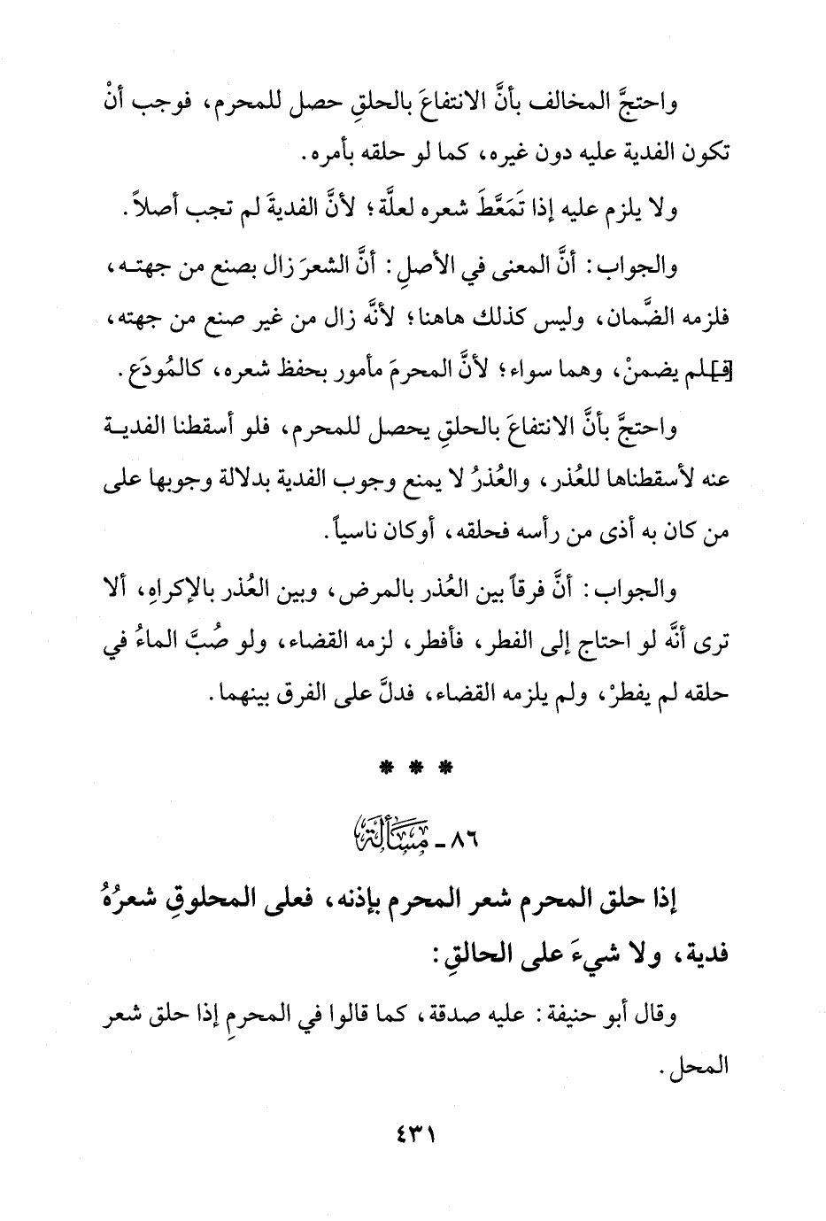 واحتج بأن الانتفاع بالحلق للمحرم, فلو أسقطنا الفدية عنه لأسقطناها للعذر لا يمنع وجوب الفدية بدلالة وجوبها على من كان به أذى من رأسه فحلقه, أو كان ناسيًا.