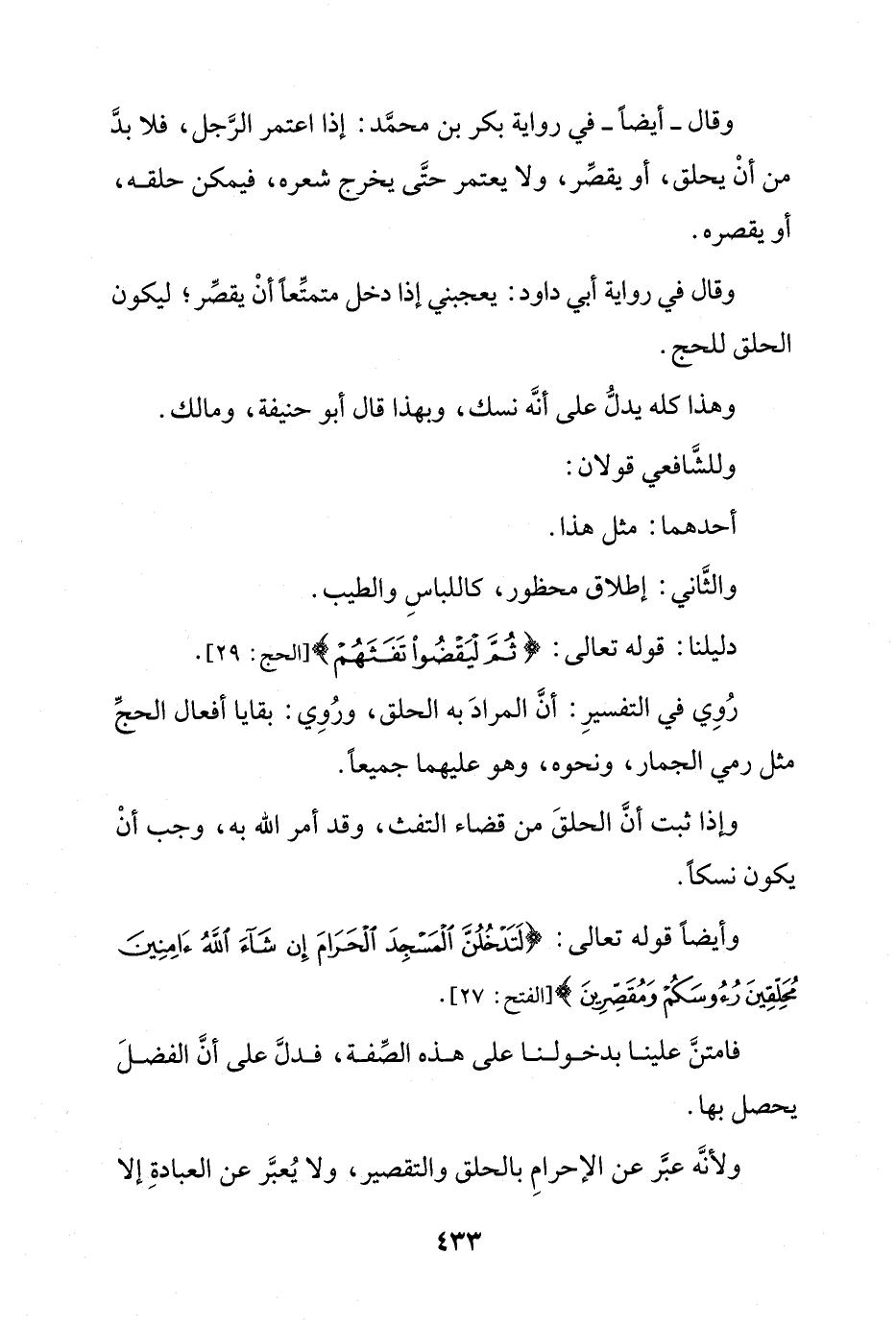 وإذا ثبت أن الحلق من قضاء التفث وقد أمر الله به, وجب أن يكون نسكًا.