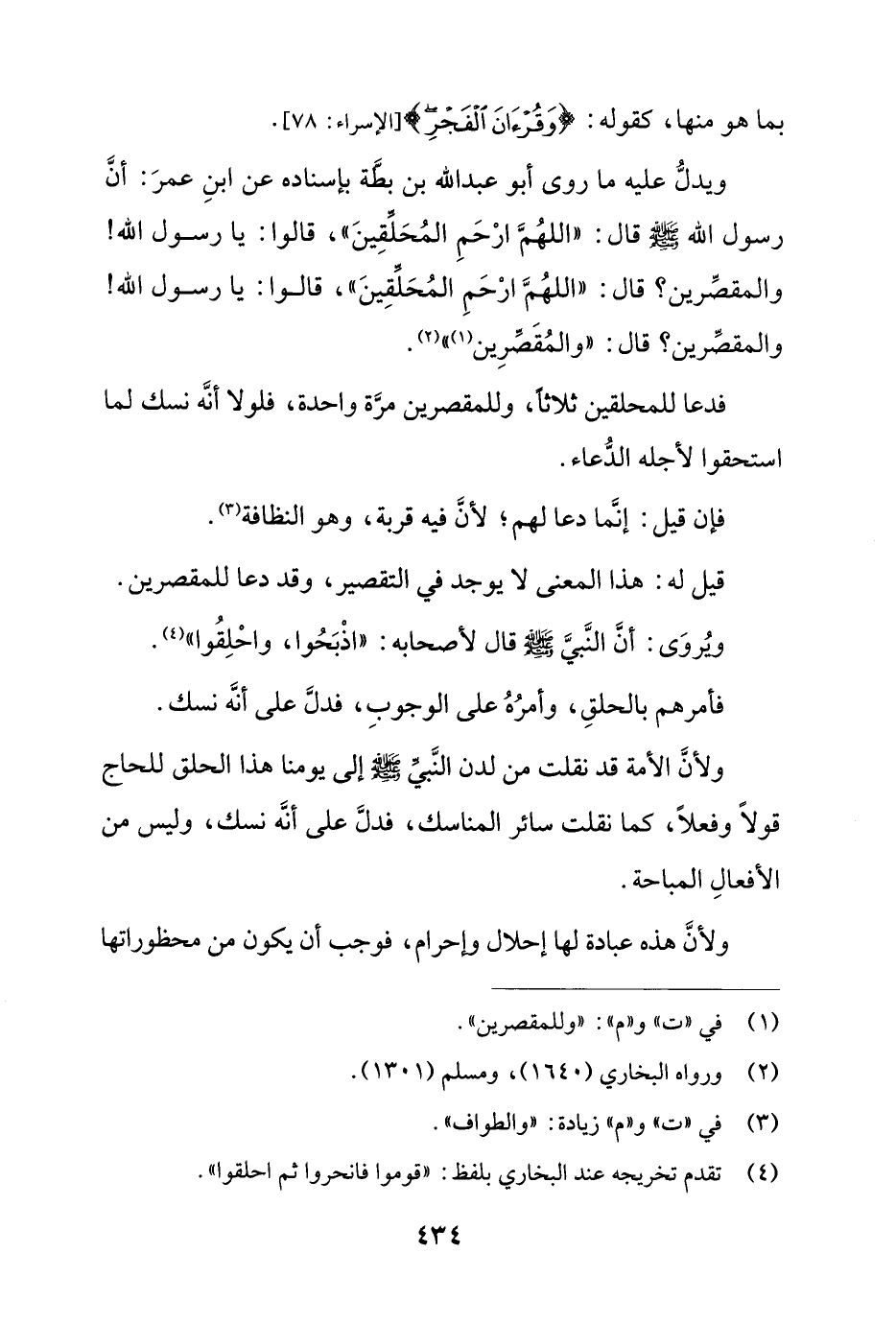 ويدل عليه ما روى أبو عبد الله بن بطة بإسناده عن ابن عمر: أن رسول الله صلى الله عليه وسلم قال: ((اللهم ارحم المحلقين)) , قالوا: يا رسول الله!