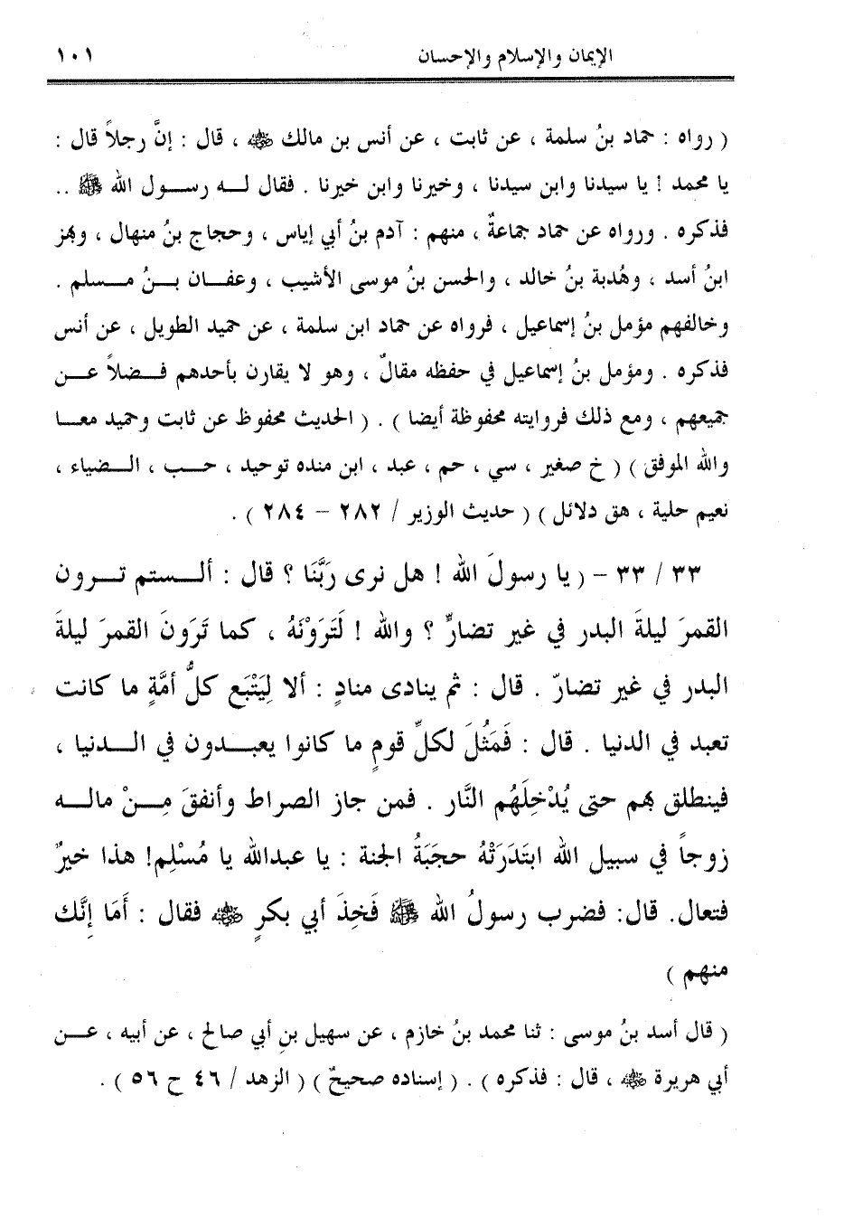 33/ 33 - (يا رسولَ الله! هل نرى رَبَّنَا؟ قال: ألستم ترون القمرَ ليلةَ البدر في غير تضارٍّ؟ والله! لَتَرَوْنَهُ، كما تَرَونَ القمرَ ليلةَ البدر في غير تضارّ. قال: ثم ينادى منادٍ: ألا لِيَتْبَع كل أمَّةٍ ما كانت تعبد في الدنيا. قال: فَمَثُلَ لكلِّ قومٍ ما كانوا يعبدون في الدنيا، فينطلق بهم حتى يُدْخِلَهُم النَّار. فمن جاز الصراط وأنفقَ مِنْ ماله زوجًا في سبيل الله ابتَدَرَتْهُ حجَبَةُ الجنة: يا عبد الله يا مُسْلِم! هذا خيرٌ فتعال. قال: فضرب رسولُ الله - صلى الله عليه وسلم - فَخِذَ أبي بكرٍ - رضي الله عنه - فقال: أَمَا إِنَّك منهم).