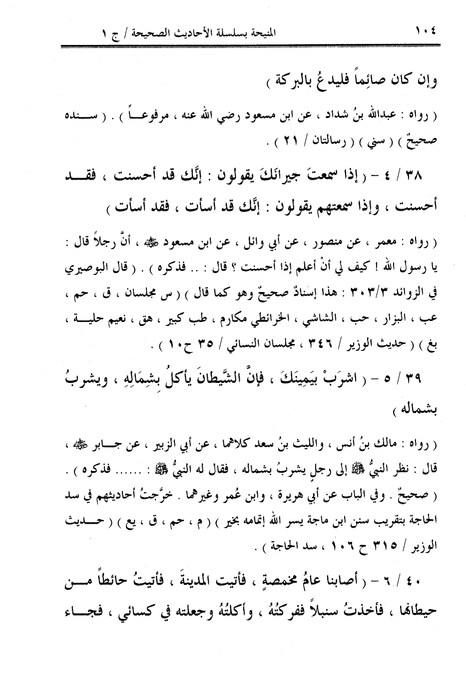 39/ 5 - (اشرَبْ بيَمِينَكَ، فإنَّ الشَّيطانَ يأكلُ بِشِمَالِهِ، ويشربُ بشماله).