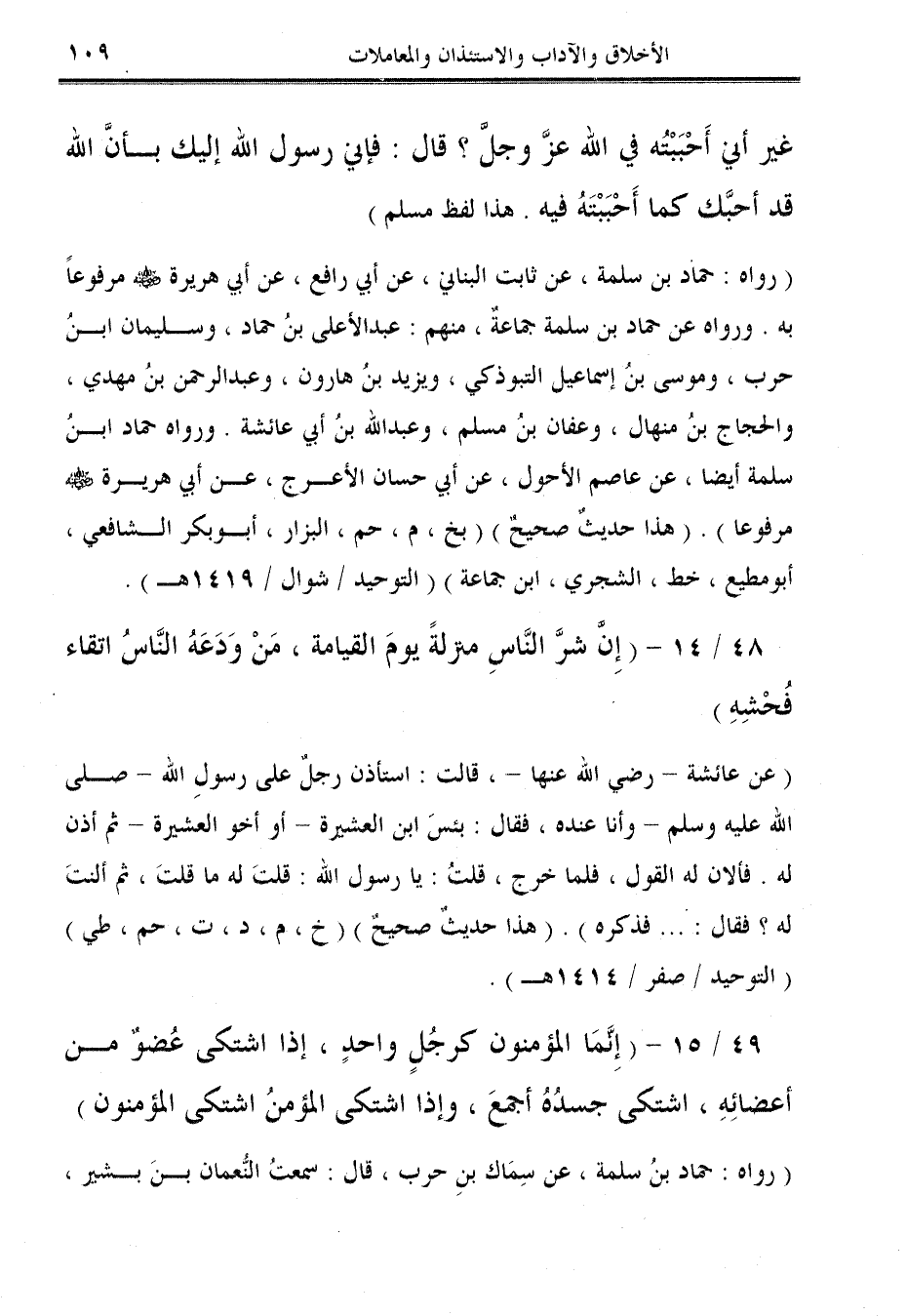 (عن عائشة - رضي الله عنها -، قالت: استأذن رجلٌ على رسولِ الله - صلى الله عليه وسلم - وأنا عنده، فقال: بئسَ ابن العشيرة -أو أخو العشيرة- ثم أذن له. فألان له القول، فلما خرج، قلتُ: يا رسول الله: قلتَ له ما قلتَ، ثم ألنتَ له؟ فقال: ... فذكره). (هذا حديثٌ صحيحٌ) (خ، م، د، ت، حم، طي). (التوحيد / صفر / 1414 هـ).