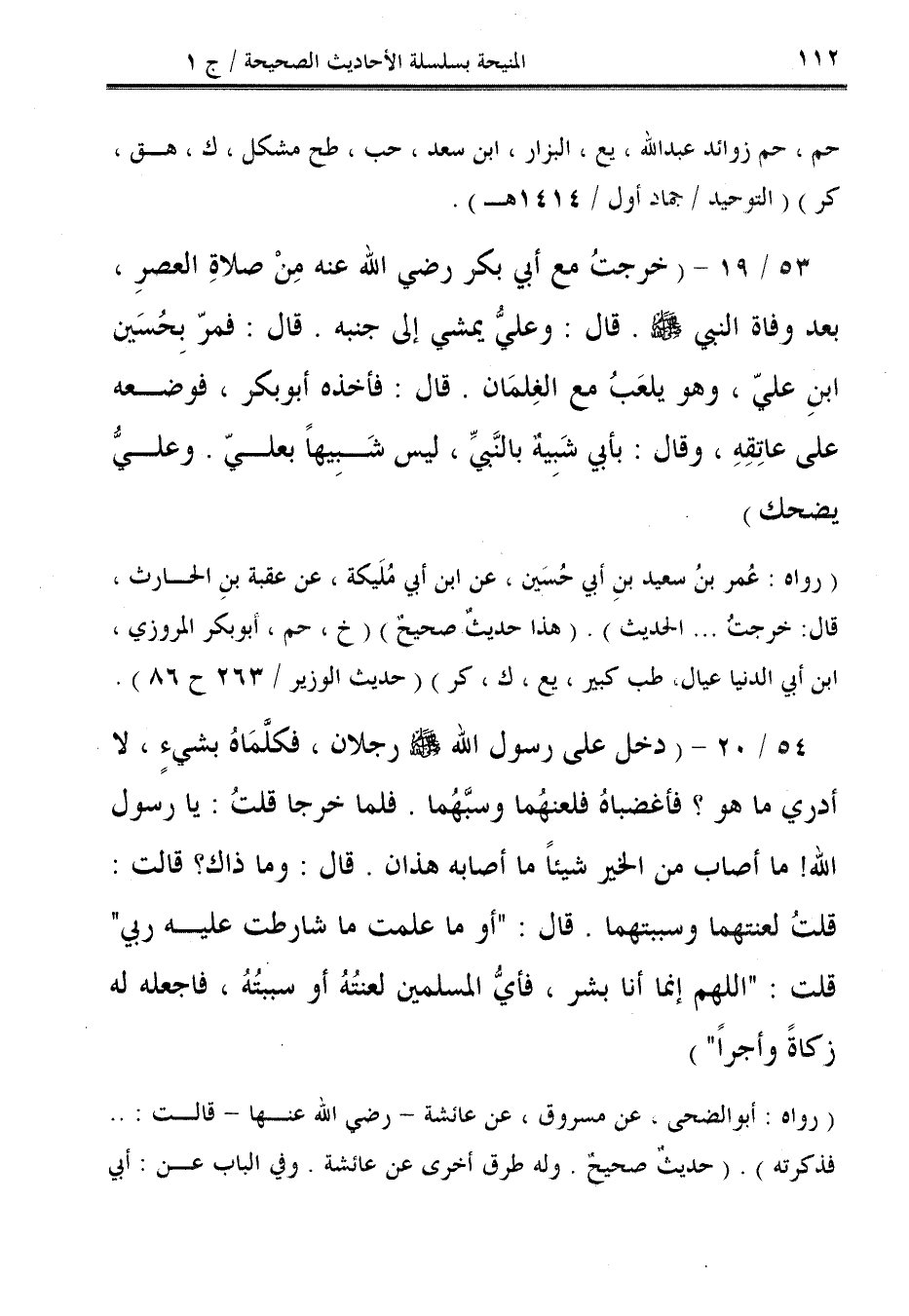 53/ 19 - (خرجتُ مع أبي بكر رضي الله عنه مِنْ صلاةِ العصرِ، بعد وفاة النبي - صلى الله عليه وسلم -. قال: وعليُّ يمشي إلى جنبه. قال: فمرّ بِحُسَين ابنِ عليّ، وهو يلعَبُ مع الغِلمَان. قال: فأخذه أبو بكر، فوضعه على عاتِقِهِ، وقال: بأبي شَبِيهٌ بالنَّبيِّ، ليس شَبِيهًا بعليّ. وعليُّ يضحك).