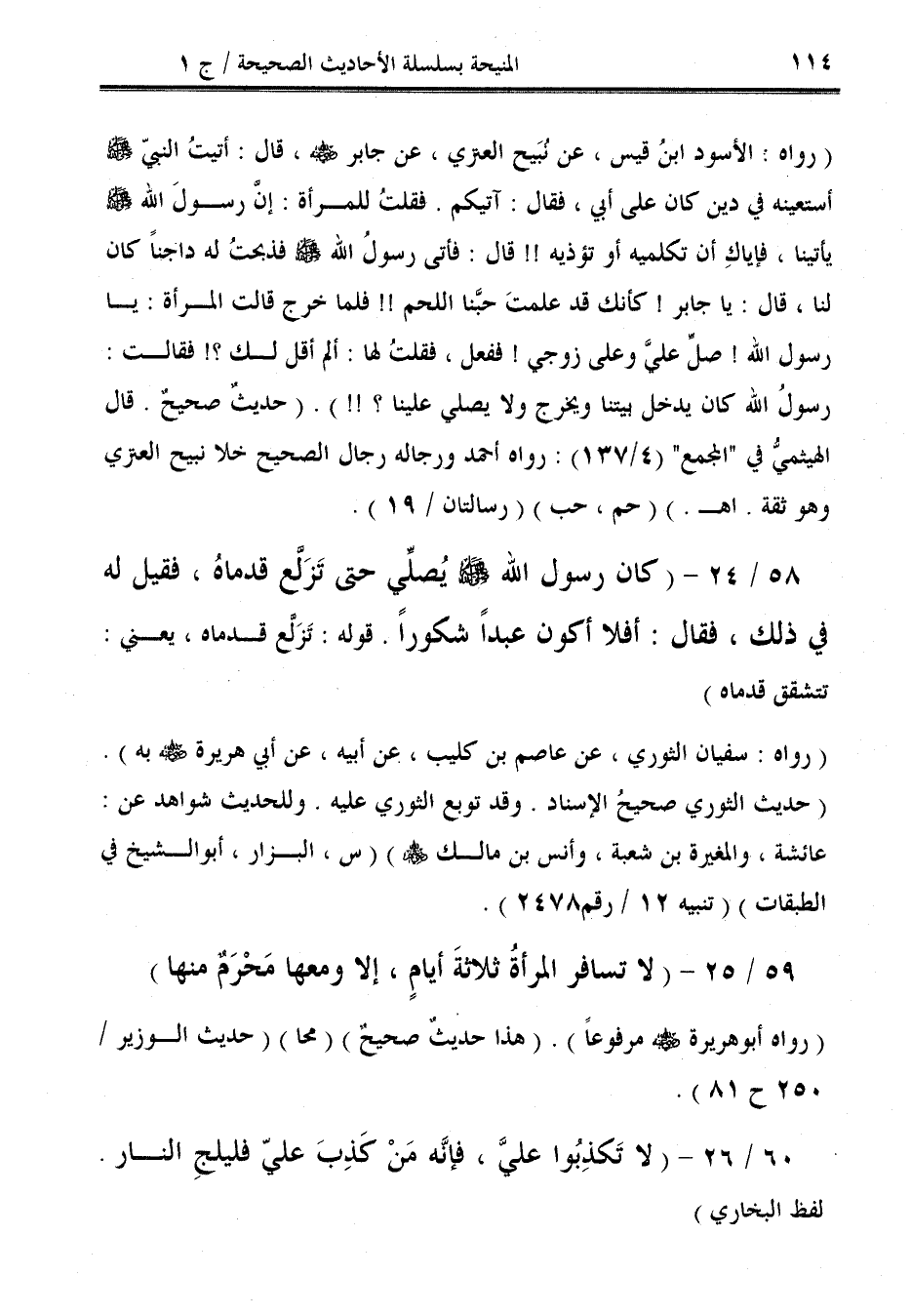 59/ 25 - (لا تسافر المرأةُ ثلاثةَ أيامٍ، إلا ومعها مَحْرَمٌ منها).