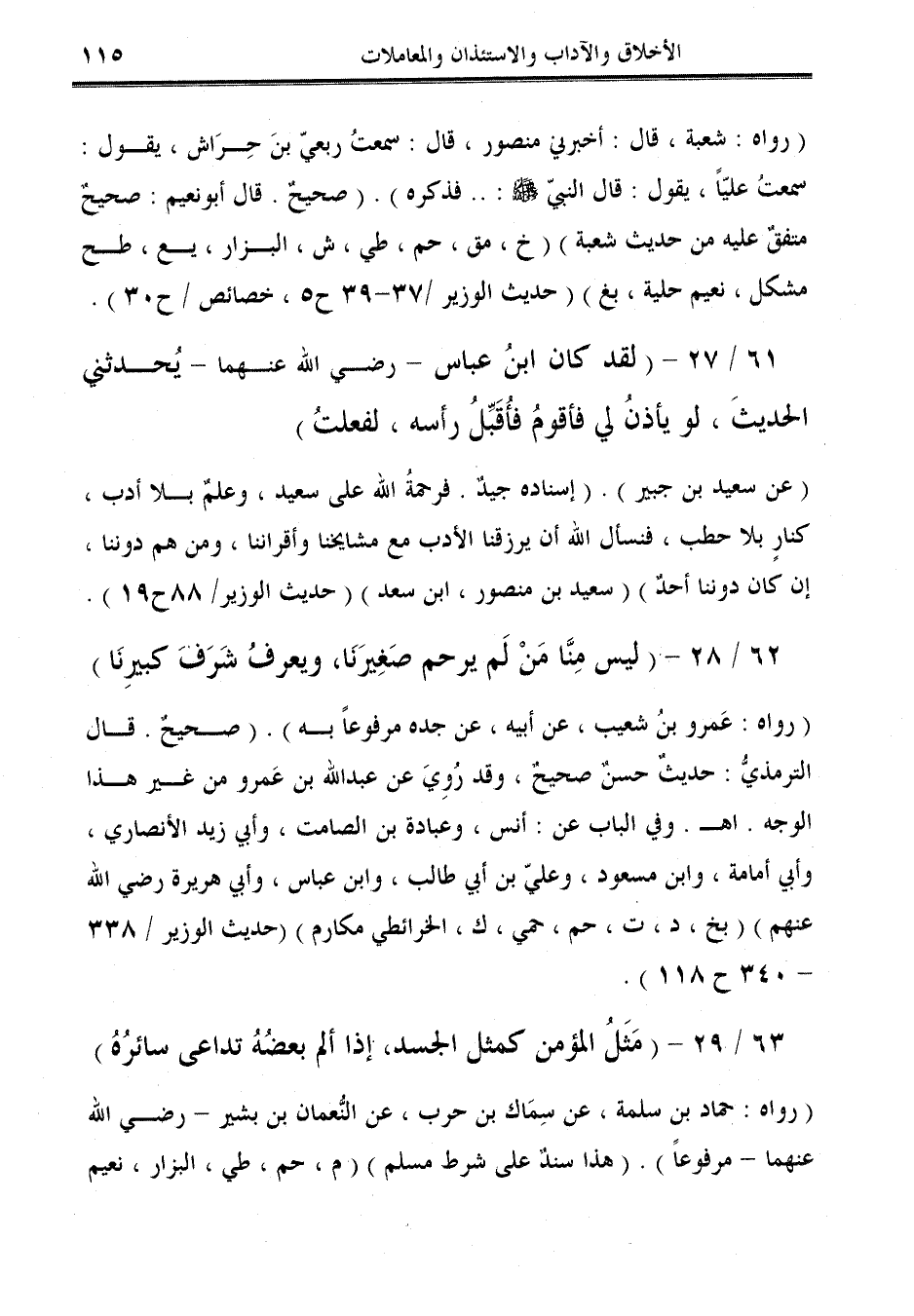 (رواه: عَمرو بنُ شعيب، عن أبيه، عن جده مرفوعًا به). (صحيحٌ. قال الترمذيُّ: حديثٌ حسنٌ صحيحٌ، وقد رُوِيَ عن عبد الله بن عَمرو من غير هذا الوجه. اهـ. وفي الباب عن: أنس, وعبادة بن الصامت، وأبي زيد الأنصاري، وأبي أمامة، وابن مسعود، وعليّ بن أبي طالب، وابن عباس، وأبي هريرة رضي الله عنهم) (بخ، د، ت، حم، حمي، ك، الحرائطي مكارم) (حديث الوزير/ 338 - 340 ح 118).