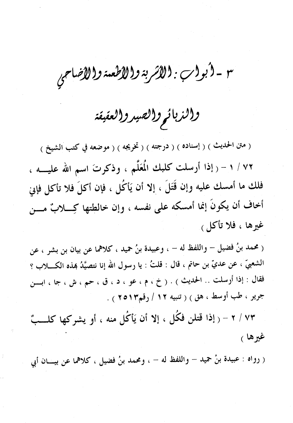 (محمد بنُ فضيل -واللفظ له-، وعبيدة بنُ حميد، كلاهما عن بيان بن بشر، عن الشعبيّ، عن عديّ بن حاتم، قال: قلتُ: يا رسول الله إنا نتصيَّدُ بهذه الكلاب؟ فقال: إذا أرسلت .. الحديث). (خ، م، عو، د، ق، حم، ش، جا، ابن جرير، طب أوسط، هق) (تنبيه 12 / رقم 2513).