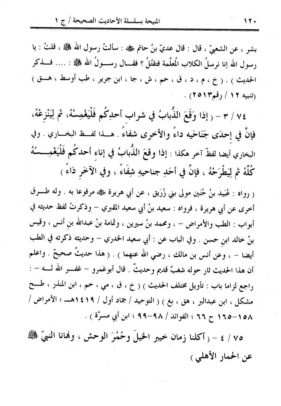 74/ 3 - (إذا وَقَعَ الذُّبابُ في شرابِ أحدِكُم فَلْيَغْمِسْهُ، ثم لِيَنْزِعْهُ، فإنَّ في إِحدَى جَنَاحَيه داءً والأخرى شفاءً. هذا لفظ البخاري. وفي البخاري أيضًا لفظٌ آخر هكذا: إذا وقعَ الذبابُ في إناءِ أحدكُم فَلْيَغمِسْهُ كُلَّهُ ثم لِيَطْرَحْهُ، فإنَّ في أحَدِ جناحيهِ شِفَاءً، وفي الآخَرِ دَاءً).