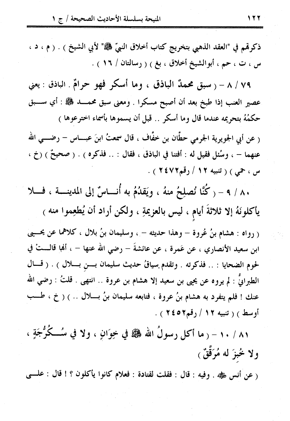 79/ 8 - (سبق محمدٌ الباذق، وما أسكر فهو حرامٌ. الباذق: يعني عصير العنب إذا طبخ بعد أن أصبح مسكرا. ومعنى سبق محمد - صلى الله عليه وسلم -: أي سبق حكمُهُ بتحريمه عندما قال وما أسكر .. قبل أن يسموها بأسماء اخترعوها).
