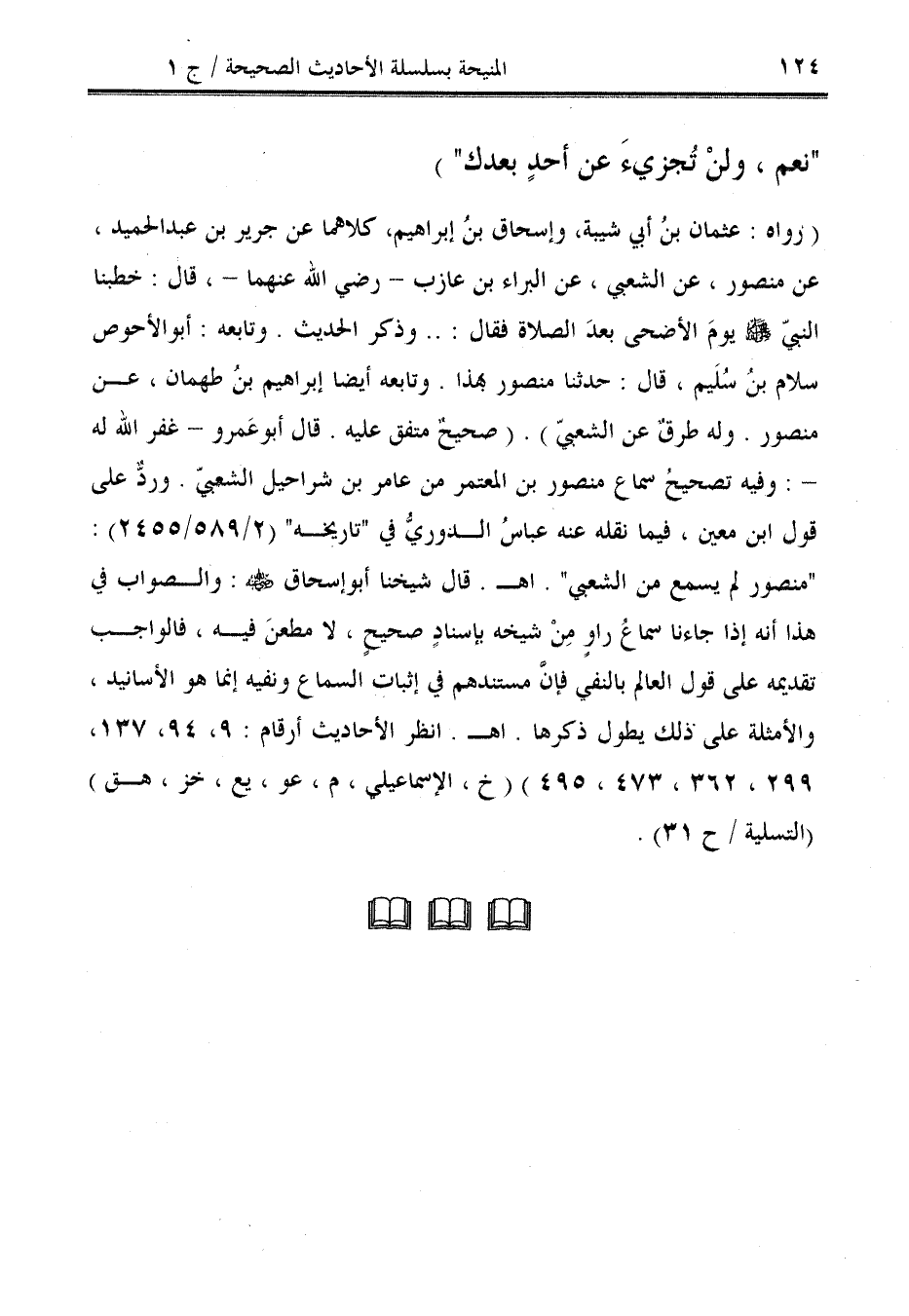 (رواه: عثمان بنُ أبي شيبة، وإسحاق بنُ إبراهيم، كلاهما عن جرير بن عبد الحميد، عن منصور، عن الشعبي، عن البراء بن عازب - رضي الله عنهما -، قال: خطبنا النبيّ - صلى الله عليه وسلم - يومَ الأضحى بعدَ الصلاة فقال: .. وذكر الحديث. وتابعه: أبو الأحوص سلام بنُ سُلَيم، قال: حدثنا منصور بهذا. وتابعة أيضًا إبراهيم بنُ طهمان، عن منصور. وله طرقٌ عن الشعبيّ). (صحيحٌ متفق عليه. قال أبو عَمرو -غفر الله له-: وفيه تصحيحُ سماع منصور بن المعتمر من عامر بن شراحيل الشعبيّ. وردٌّ على قول ابن معين، فيما نقله عنه عباسُ الدوريُّ في "تاريخه" (2/ 589/ 2455):