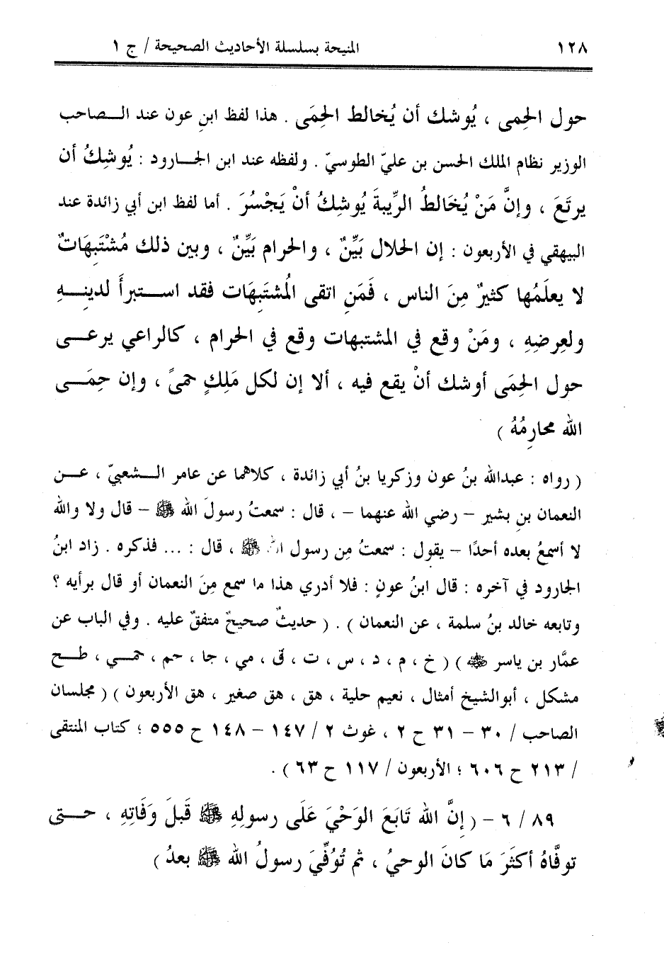 (رواه: عبد الله بنُ عون وزكريا بنُ أبي زائدة، كلاهما عن عامر الشعبيّ، عن النعمان بنِ بشير - رضي الله عنهما -، قال: سمعتُ رسولَ الله صلى الله عليه وسلم -قال ولا والله لا أسمعُ بعده أحدًا- يقول: سمعتُ مِن رسول الله - صلى الله عليه وسلم -، قال: ... فذكره. زاد ابنُ الجارود في آخره: قال ابنُ عونٍ: فلا أدري هذا كل ما سمع مِنَ النعمان أو قال برأيه؟ وتابعه خالد بنُ سلمة، عن النعمان). (حديثٌ صحيحٌ متفقٌ عليه. وفي الباب عن عمَّار بن ياسر - رضي الله عنه -) (خ، م، د، س، ت، ق، مي، جا، حم، حمي، طح مشكل، أبو الشيخ أمثال، نعيم حلية، هق، هق صغر، هق الأربعون) (مجلسان الصاحب/ 30 - 31 ح 2، غوث 2/ 147 - 148 ح 555؛ كتاب المنتقى / 213 ح 606؛ الأربعون / 117 ح 63).