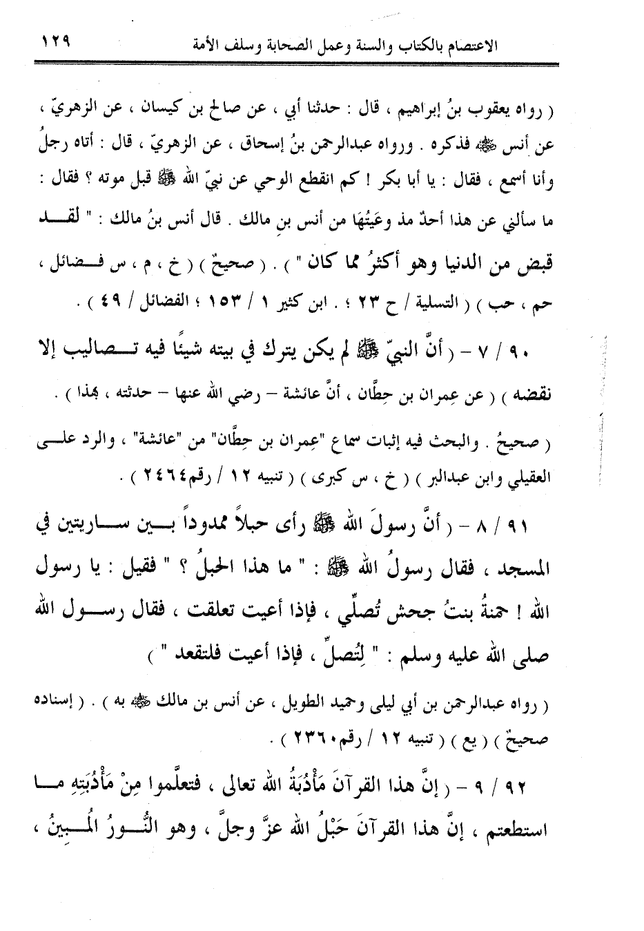 91/ 8 - (أنَّ رسولَ الله - صلى الله عليه وسلم - رأى حبلاً ممدودًا بين ساريتين في المسجد، فقال رسولُ الله - صلى الله عليه وسلم -: "ما هذا الحبلُ؟ " فقيل: يا رسول الله! حمنةُ بنتُ جحش تُصلِّي، فإذا أعيت تعلقت، فقال رسول الله صلى الله عليه وسلم: "لِتُصلِّ، فإذا أعيت فلتقعد").
