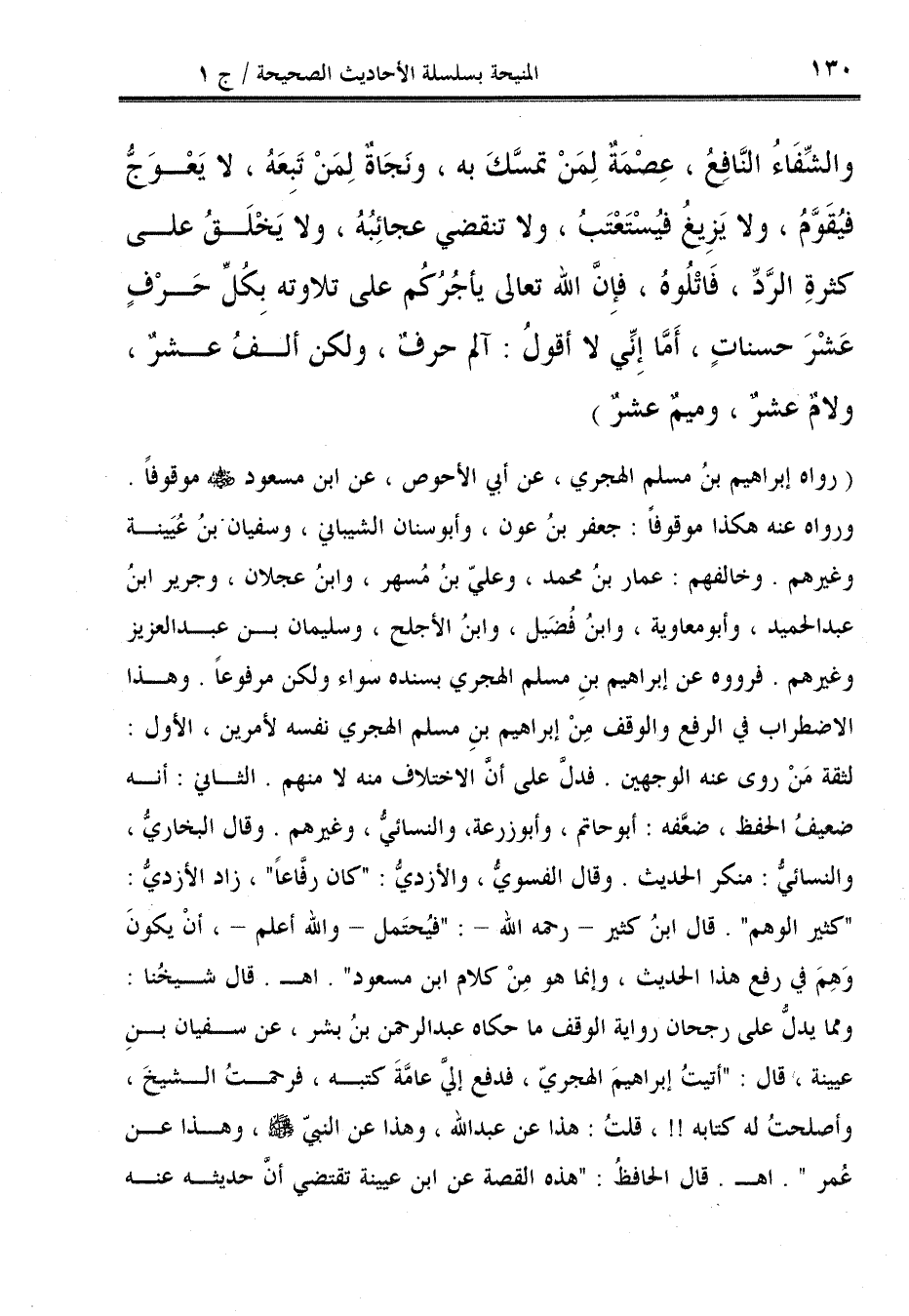 ورواه عنه هكذا موقوفًا: جعفر بنُ عون، وأبو سنان الشيباني، وسفيان بنُ عُيَينة وغيرهم. وخالفهم: عمار بنُ محمد، وعليّ بنُ مُسهر، وابنُ عجلان، وجرير ابنُ عبد الحميد، وأبو معاوية، وابنُ فُضَيل، وابنُ الأجلح، وسليمان بن عبد العزيز وغيرهم. فرووه عن إبراهيم بنِ مسلم الهجري بسنده سواء ولكن مرفوعًا. وهذا الاضطراب في الرفع والوقف مِنْ إبراهيم بنِ مسلم الهجري نفسه لأمرين، الأول: لثقة مَنْ روى عنه الوجهين. فدلَّ على أنَّ الاختلاف منه لا منهم. الثاني: أنه ضعيفُ الحفظ، ضعَّفه: أبو حاتم، وأبو زرعة، والنسائيُّ، وغيرهم. وقال البخاريُّ، والنسائيُّ: منكر الحديث. وقال الفسويُّ، والأزديُّ: "كان رفَّاعًا"، زاد الأزديُّ: "كثير الوهم". قال ابنُ كثير - رحمه الله -: "فيُحتَمل -والله أعلم-، أنْ يكونَ وَهِمَ في رفع هذا الحديث، وإنما هو مِنْ كلام ابن مسعود". اهـ. قال شيخُنا: ومما يدلُّ على رجحان رواية الوقف ما حكاه عبد الرحمن بنُ بشر، عن سفيان بنِ عيينة، قال: "أتيتُ إبراهيمَ الهجريّ، فدفع إليَّ عامَّةَ كتبه، فرحمتُ الشيخَ، وأصلحتُ له كتابه!!، قلتُ: هذا عن عبد الله، وهذا عن النبيّ - صلى الله عليه وسلم -، وهذا عن عُمر". اهـ، قال الحافظُ: "هذه القصة عن ابن عيينة تقتضي أنَّ حديثه عنه