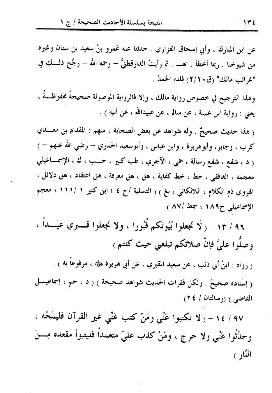 97/ 14 - (لا تكتبوا عَنِّي ومَنْ كتب عَنِّي غير القرآن فليمْحُه، وحدِّثُوا عَنِّي ولا حرج، ومَنْ كذب عليّ متعمدًا فليتبوأ مقعده مِنَ النَّار).