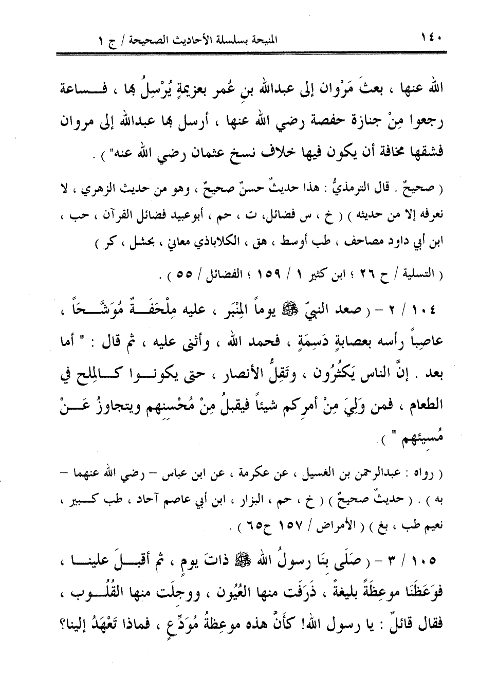 105/ 3 - (صَلَى بِنَا رسولُ الله - صلى الله عليه وسلم - ذاتَ يومٍ، ثم أقبلَ علينا، فوَعَظَنَا موعِظَةً بليغةً، ذَرَفَت منها العُيُون، ووجلَت منها القُلُوب، فقال قائلٌ: يا رسول الله! كأَن هذه موعِظةُ مُوَدًّعٍ، فإذا تَعْهَدُ إلينا؟