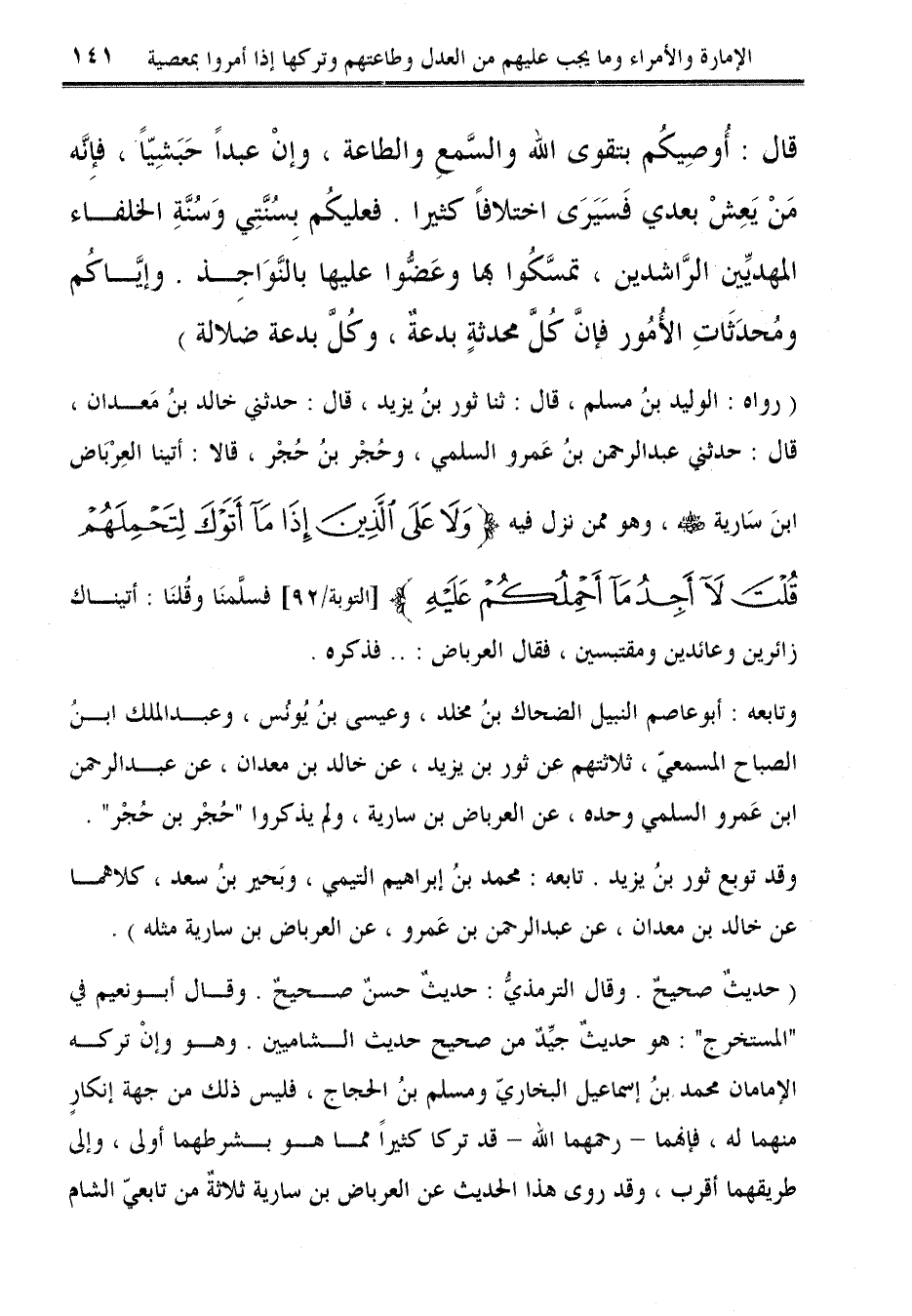 (رواه: الوليد بنُ مسلم، قال: ثنا ثور بنُ يزيد، قال: حدثني خالد بنُ مَعدان، قال: حدثني عبد الرحمن بنُ عَمرو السلمي، وحُجْر بنُ حُجْر، قالا: أتينا العِرْبَاض ابنَ سَارية - رضي الله عنه -، وهو ممن نزل فيه {وَلَا عَلَى الَّذِينَ إِذَا مَا أَتَوْكَ لِتَحْمِلَهُمْ قُلْتَ لَا أَجِدُ مَا أَحْمِلُكُمْ عَلَيْهِ} [التوبة: 92] فسلَّمنَا وقُلنا: أتيناك زائرين وعائدين ومقتبسمين، فقال العرباض: .. فذكره.
