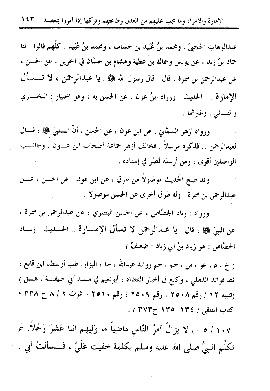 عبد الوهاب الحجبيّ، ومحمد بنُ عُبَيد بن حساب، ومحمد بنُ عُبَيد. كلُّهم قالوا: ثنا حماد بنُ زيد، عن يونس وسماك بن عطية وهشام بن حسَّان في آخرين، عن الحسن، عن عبد الرحمن بن سمرة، قال: قال رسول الله - صلى الله عليه وسلم -: يا عبد الرحمن، لا تسأل الإمارة ... الحديث. ورواه ابنُ عون، عن الحسن به؛ وهو اختيار: البخاري والنسائي، وغيرهما.
