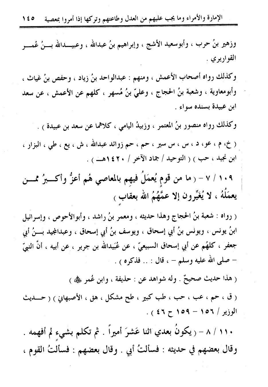 110/ 8 - (يكونُ بعدي اثنا عَشرَ أميرًا. ثم تكلم بشيءٍ لم أفهمه. وقال بعضهم في حديثه: فسألتُ أبي. وقال بعضهم: فسألتُ القوم،