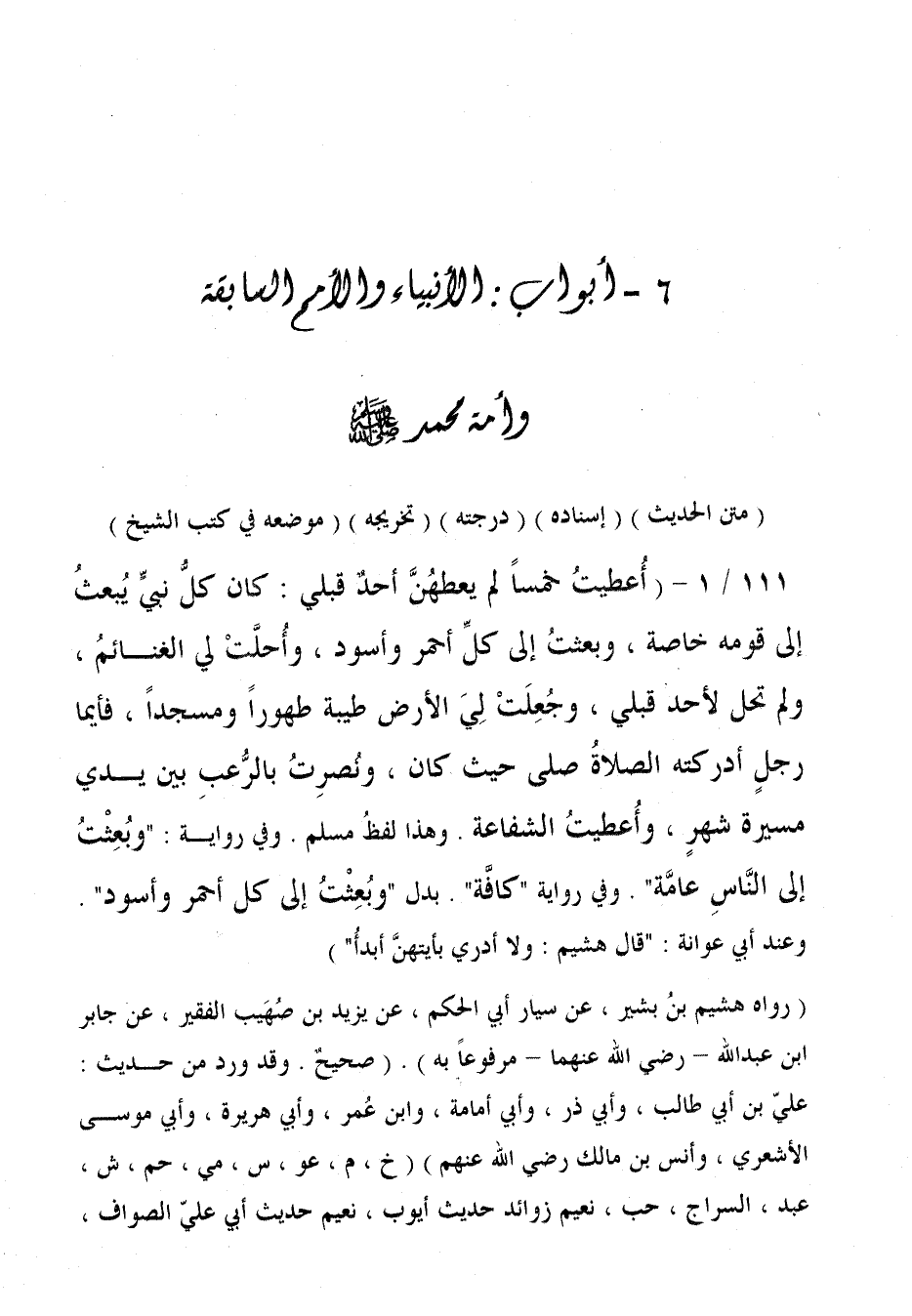 111/ 1 - (أُعطيتُ خمسًا لم يعطهُنَّ أحدٌ قبلي: كان كلُّ نبيِّ يُبعثُ إلى قومه خاصة، وبعثتُ إلى كلِّ أحمر وأسود، وأُحلَّتْ لي الغنائمُ، ولم تحل لأحد قبلي، وجُعِلَتْ لِيَ الأرض طيبة طهورًا ومسجدًا، فأيما رجلٍ أدركته الصلاةُ صلى حيث كان، ونصرتُ بالرُّعبِ بين يدي مسيرة شهرٍ، وأُعطيتُ الشفاعة. وهذا لفظُ مسلم. وفي رواية: "وبُعِثْتُ إلى النَّاسِ عامَّة". وفي رواية "كافَّة" بدل "وبُعِثْتُ إلى كل أحمر وأسود". وعند أبي عوانة: "قال هشيم: ولا أدري بأيتهن أبدأُ").