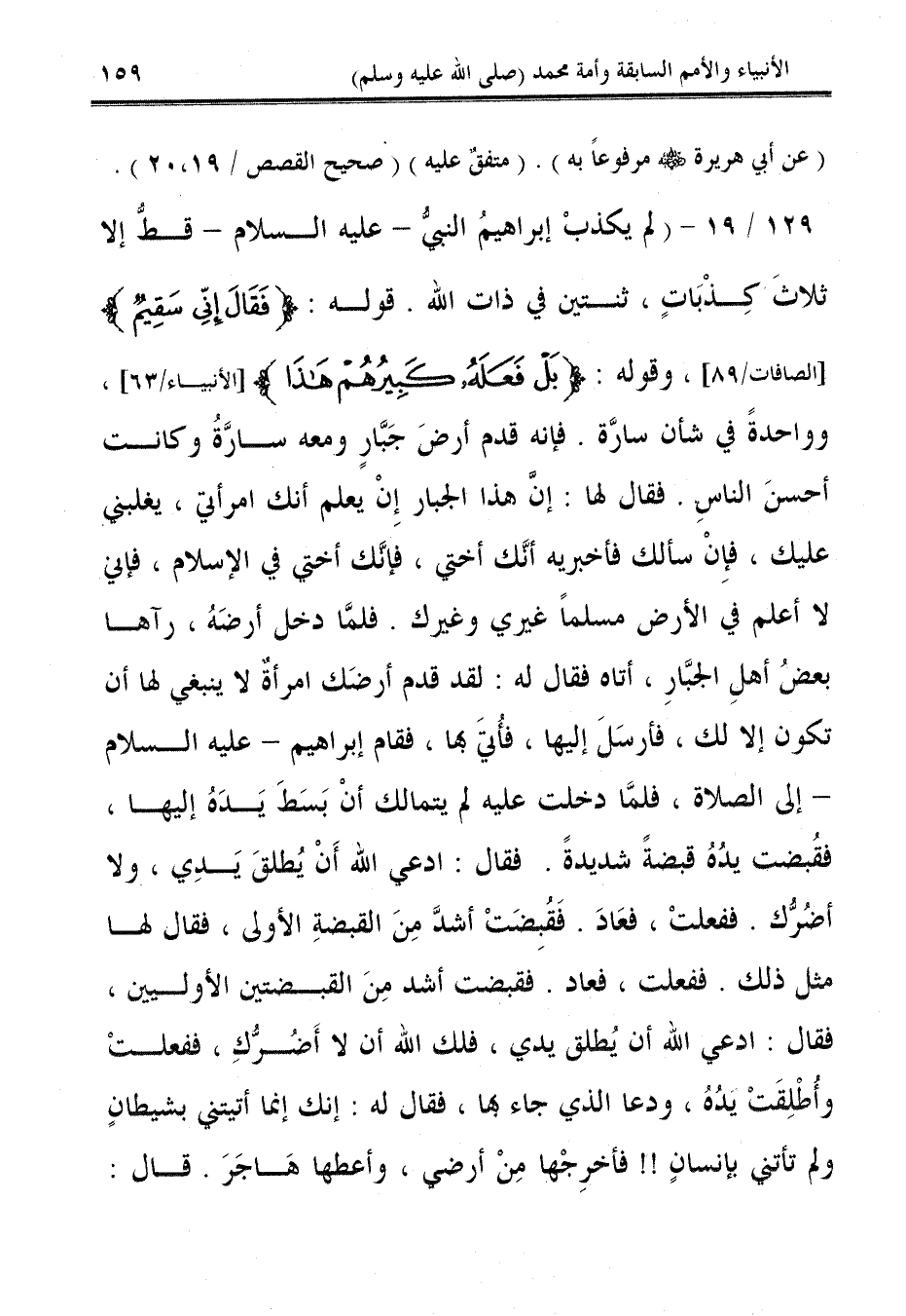 129/ 19 - (لم يكذبْ إبراهيمُ النبي - عليه السلام - قطُّ إلا ثلاثَ كِذْبَاتٍ، ثنتين في ذات الله. قوله: {فَقَالَ إِنِّي سَقِيمٌ} [الصافات / 89]، وقوله: {بَلْ فَعَلَهُ كَبِيرُهُمْ} [الأنبياء / 63]، وواحدةً في شأن سارَّة. فإنه قدم أرضَ جَبَّارٍ ومعه سارَّةُ وكانت أحسنَ الناسِ. فقال لها: إنَّ هذا الجبار إِنْ يعلم أنك امرأتي، يغلبني عليك، فإِنْ سألك فأخبريه أنَّك أختي، فإنَّك أختي في الإسلام، فإني لا أعلم في الأرض مسلمًا غيري وغيرك. فلمَّا دخل أرضَهُ، رآها بعضُ أهلِ الجبَّارِ، أتاه فقال له: لقد قدم أرضَك امرأةٌ لا ينبغي لها أن تكون إلا لك، فأرسَلَ إليها، فأُتيَ بها، فقام إبراهيم - عليه السلام - إلى الصلاة، فلمَّا دخلت عليه لم يتمالك أنْ بَسَطَ يَدَهُ إليها، فقُبضت يدُهُ قبضةً شديدةً. فقال: ادعي الله أَنْ يُطلقَ يَدِي، ولا أضُرُّك. ففعلتْ، فعَادَ. فَقُبِضَتْ أشدَّ مِنَ القبضةِ الأولى، فقال لها مثل ذلك. ففعلت، فعاد. فقبضت أشد مِنَ القبضتين الأوليين، فقال: ادعي الله أن يُطلق يدي، فلك الله أن لا أَضُرُّكِ، ففعلتْ وأُطْلِقَتْ يَدُهُ، ودعا الذي جاء بها، فقال له: إنك إنما أتيتني بشيطانٍ ولم تأتني بإنسانٍ!! فأخرِجْها مِنْ أرضي، وأعطها هَاجَرَ. قال: