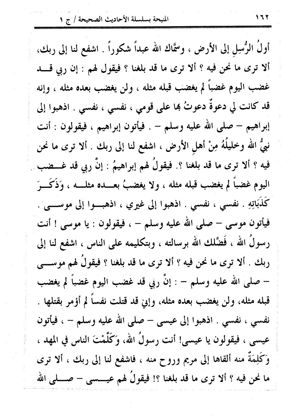 أولُ الرُّسِلِ إلى الأرض، وسمَّاك الله عبدًا شكورًا. اشفع لنا إلى ربك، ألا ترى ما نحن فيه؟ ألا ترى ما قد بلغنا؟ فيقول لهم: إنَّ ربي قد غضب اليوم غضبًا لم يغضب قبله مثله، ولن يغضب بعده مثله، وإنه قد كانت لي دعوةٌ دعوتُ بها على قومي، نفسي، نفسي. اذهبوا إلى إبراهيم - صلى الله عليه وسلم -. فيأتون إبراهيم، فيقولون: أنت نبيُّ الله وخليلُهُ مِنْ أهلِ الأرض، اشفع لنا إلى ربك. ألا ترى ما نحن فيه؟ ألا ترى ما قد بلغنا؟. فيقولُ لهم إبراهيمُ: إنَّ ربي قد غضب اليوم غضبًا لم يغضب قبله مثله، ولا يغضبُ بعده مثله، وَذَكَرَ كَذَبَاتِهِ. نفسي، نفسي. اذهبوا إلى غيري، اذهبوا إلى موسى.