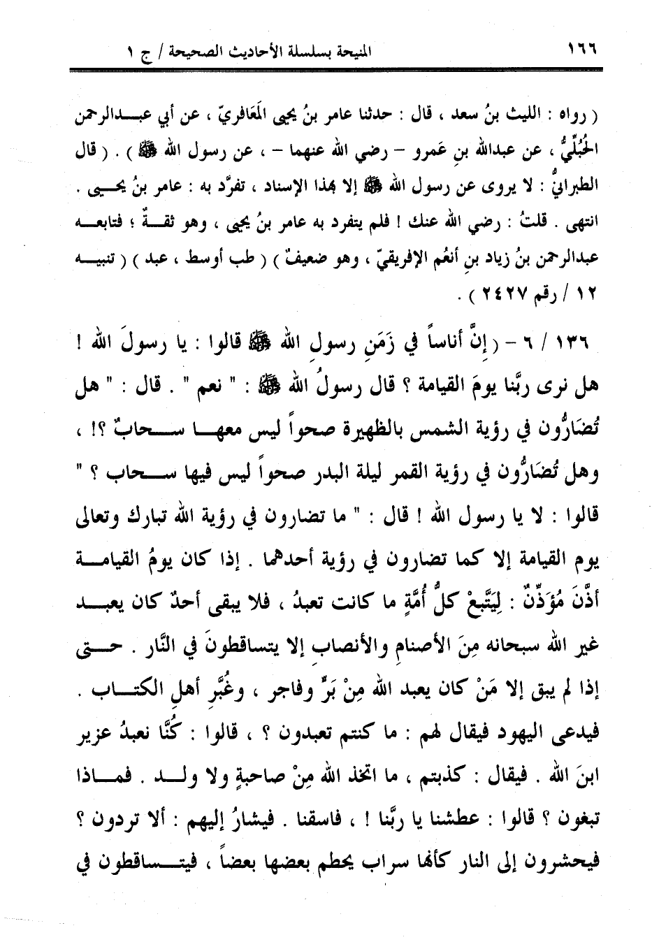 136/ 6 - (إِنَّ أناسًا في زَمَنِ رسولِ الله - صلى الله عليه وسلم - قالوا: يا رسولَ الله! هل نرى ربَّنا يومَ القيامة؟ قال رسولُ الله - صلى الله عليه وسلم -: "نعم". قال: "هل تُضَارُّون في رؤية الشمس بالظهيرة صحوًا ليس معها سحابٌ؟!، وهل تُضَارُّون في رؤية القمر ليلة البدر صحوًا ليس فيها سحاب؟ " قالوا: لا يا رسول الله! قال: "ما تضارون في رؤية الله تبارك وتعالى يوم القيامة إلا كما تضارون في رؤية أحدهما. إذا كان يومُ القيامة أذَّنَ مُؤَذِّنٌ: لِيَتَّبعْ كلُّ أُمَّةٍ ما كانت تعبدُ، فلا يبقى أحدٌ كان يعبد غير الله سبحانه مِنَ الأصنامِ والأنصابِ إلا يتساقطونَ في النَّار. حتّى إذا لم يبق إلا مَنْ كان يعبد الله مِنْ بَرٍّ وفاجر، وغُبَّرِ أهلِ الكتاب.